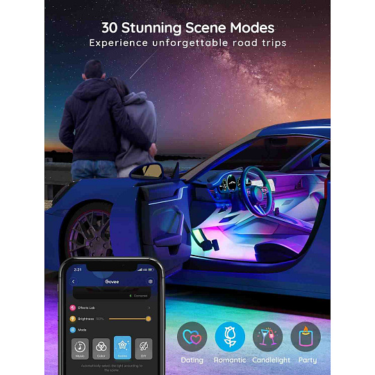Úsporné interiérové chytré LED pásky Govee Smart RGBIC do auta s životností až 50.000 hodin vylepší interiér vašeho automobilu a poskytnou zážitek, který se naskytuje u luxusních vozů. Můžete je použít prakticky všude, kde je zapalovaní. Zobrazuje až 16 milionů barev, jejichž intenzitu lze nastavit od 1-100%. Díky technologii RGBIC si můžete rozdělit pásek na samostatné segmenty, pro které si můžete pak volit rozdílné barvy. Vyberte si ze 30 režimů osvětlení a při poslouchaní oblíbené hudby se budou světla synchronizovat. Nebo si prostě nastavte svoje vlastní barevné kombinace v režimu DIY. Příkazy můžete zadat přes aplikaci Govee Home na chytrém telefonu nebo tabletu nebo přímo na Control boxu. Instalace je jednoduchá a je rozdělená na přední a zadní část automobilu.
