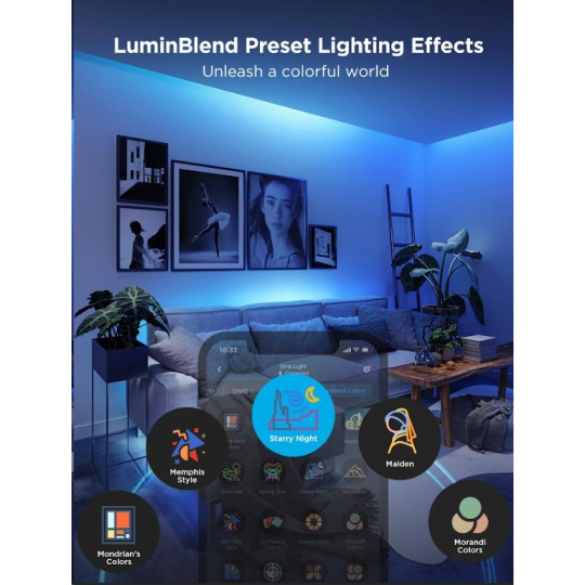 Pokročilý DIY režim LED Strip Light 2 Pro umožňuje vytvářet vlastní světelné efekty, zatímco desítky přednastavených scén vám poskytují okamžitou inspiraci pro různé příležitosti – od relaxačního večera po energickou párty. Každá scéna je navržena tak, aby maximálně využila možnosti plynulých přechodů barev a dynamických efektů. Se 16 miliony barev si můžete hrát s nekonečnými kombinacemi, které se dokonale přizpůsobí jakékoli atmosféře. Synchronizace s hudbou navíc zajišťuje, že světla oživí každý rytmus a zvýší zážitek z poslechu.