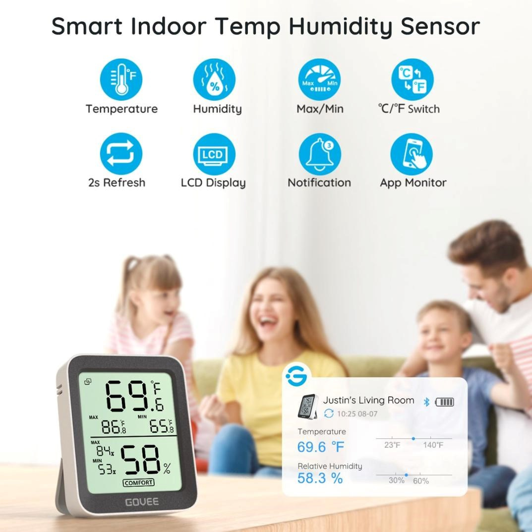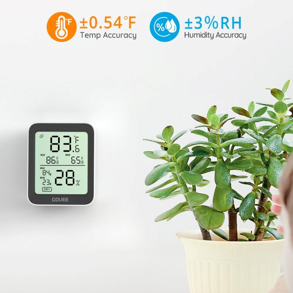 Udržujte své vnitřní prostředí pohodlné a zdravé. Chytrý monitor teploty a vlhkosti od Govee. Tento kompaktní, ale výkonný monitor klimatu zobrazuje aktuální teplotu a vlhkost na přehledném LCD displeji a díky Bluetooth připojení k telefonu máte data vždy na dosah ruky. Díky vysoce přesným senzorům (±0,3 °C pro teplotu a ±3 % RH pro vlhkost) můžete snadno sledovat změny v každé místnosti, kanceláři nebo skleníku.