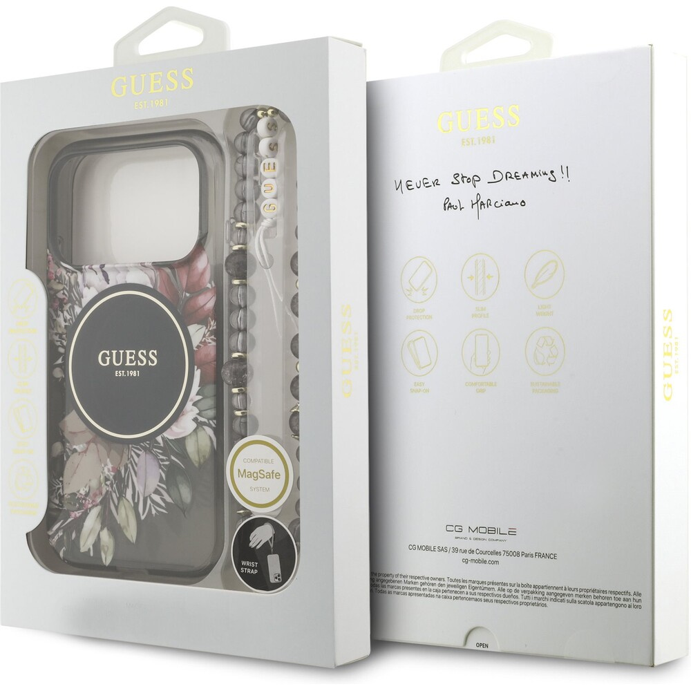 Guess IML Flowers Strap MagSafe kryt iPhone 17 Pro černý