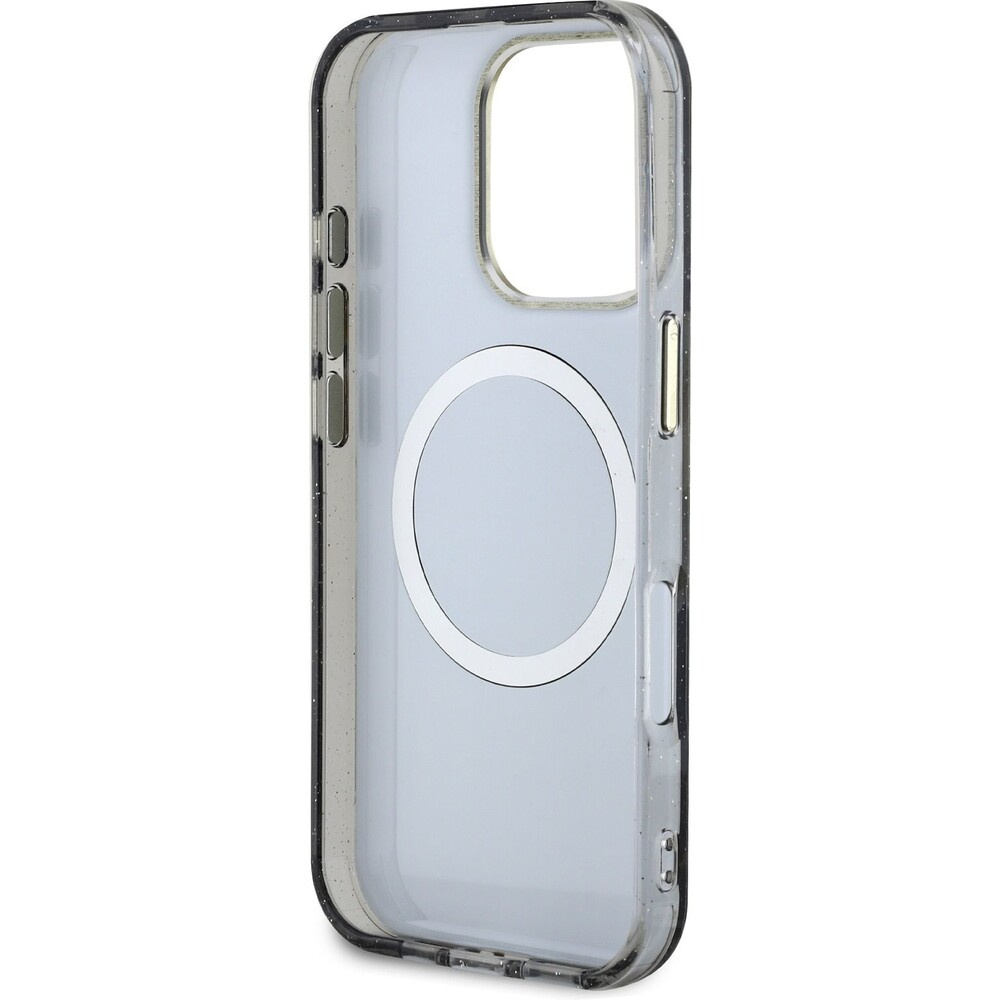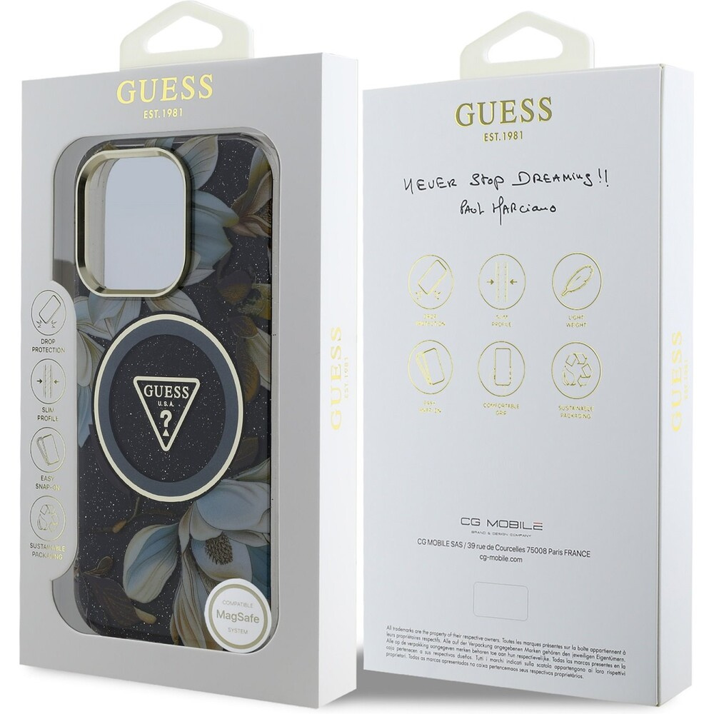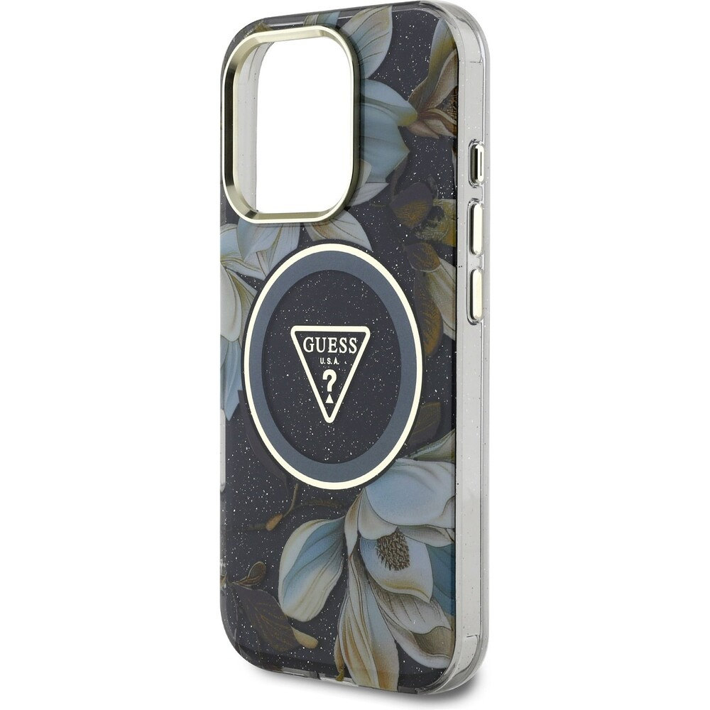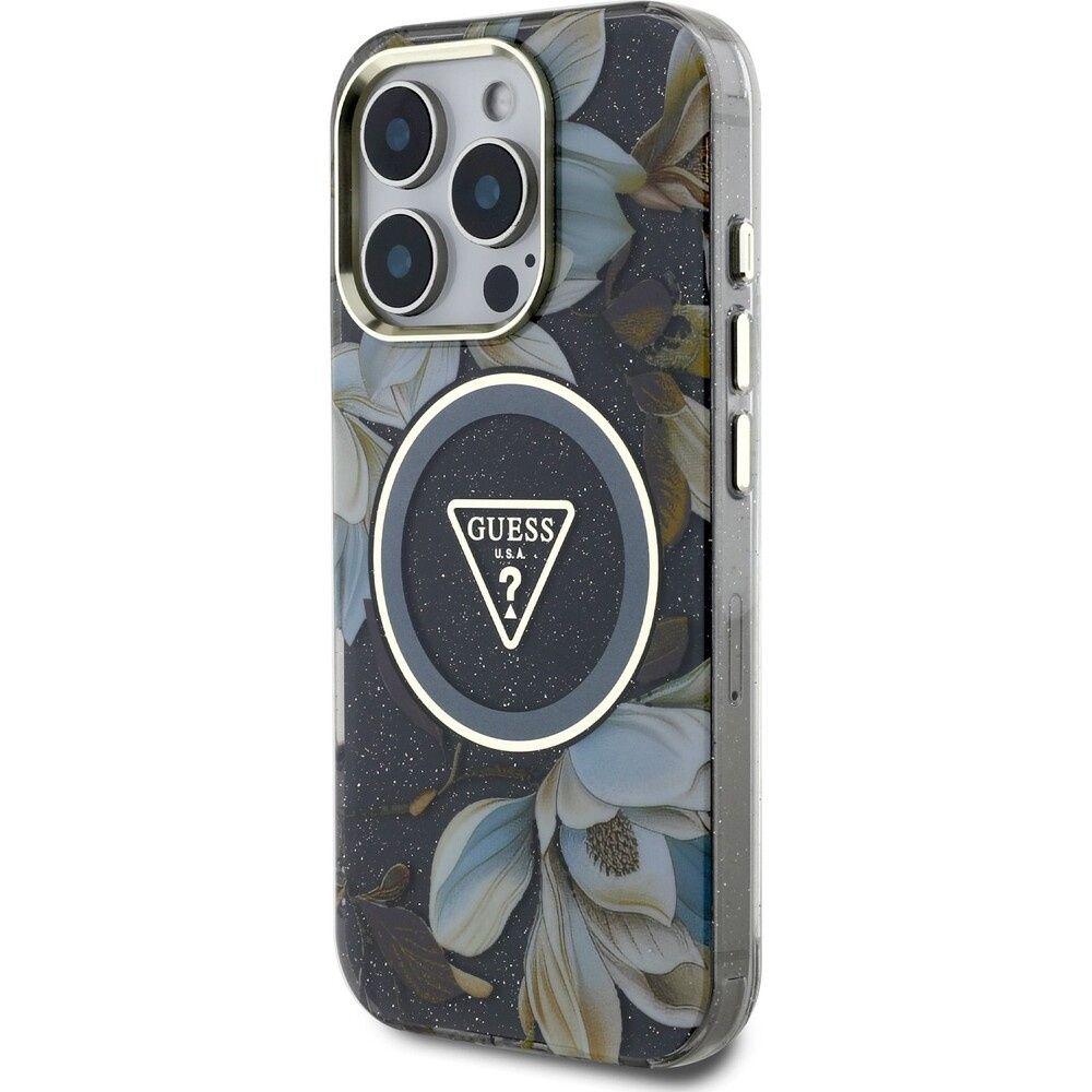 Guess IML Glitter Magnolia and Triangle Logo MagSafe kryt iPhone 16 Pro černý