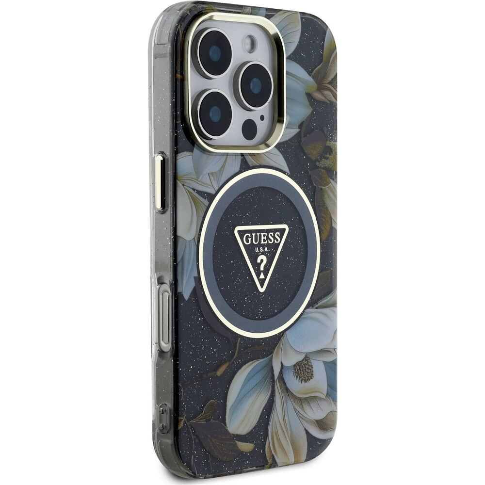 Guess IML Glitter Magnolia and Triangle Logo MagSafe kryt iPhone 16 Pro Max černý