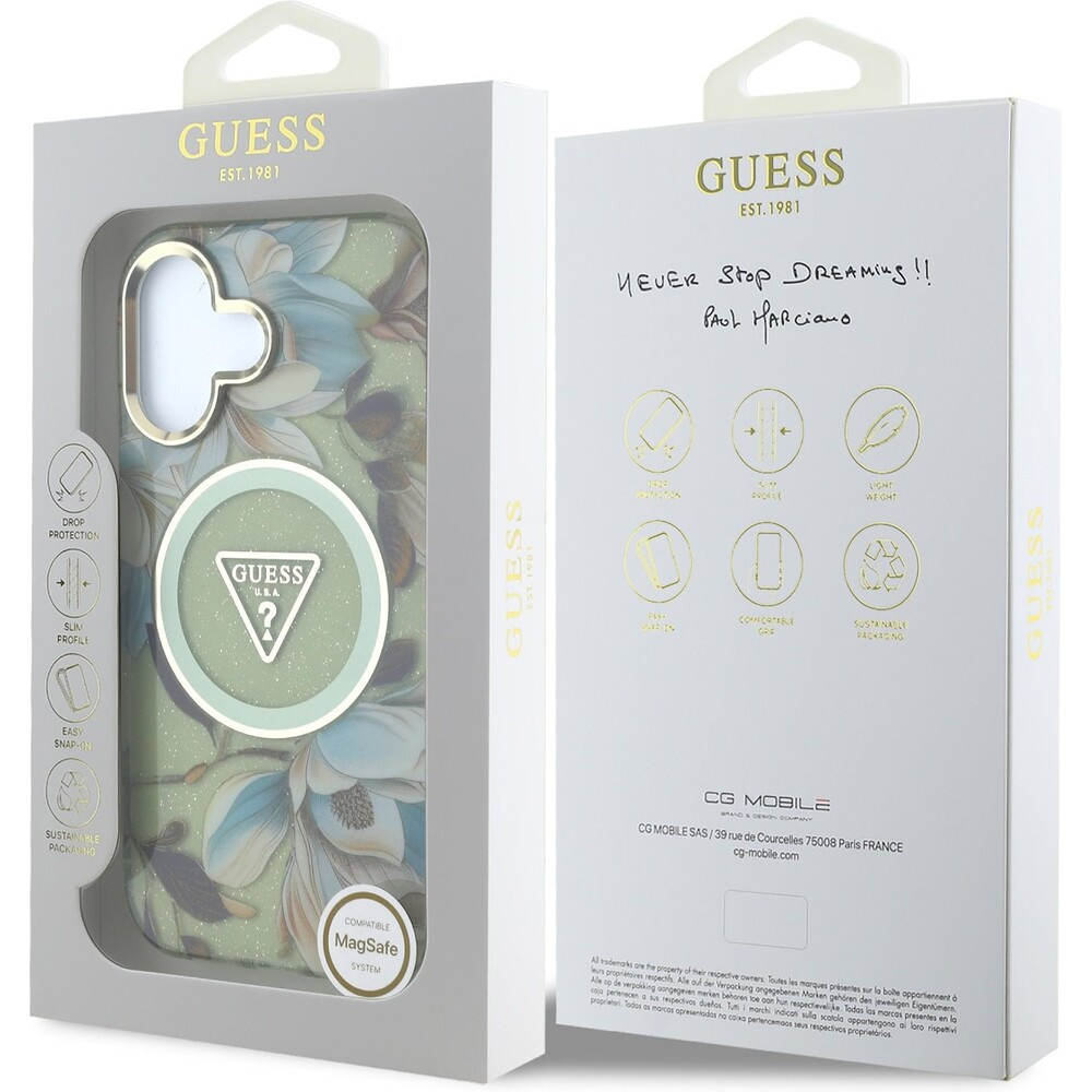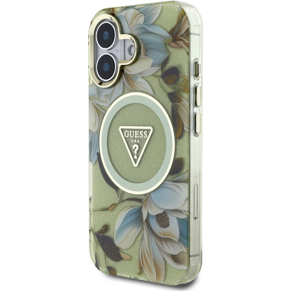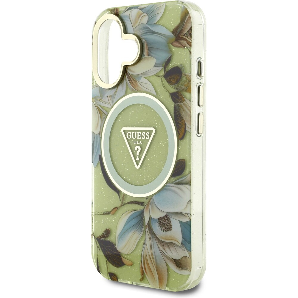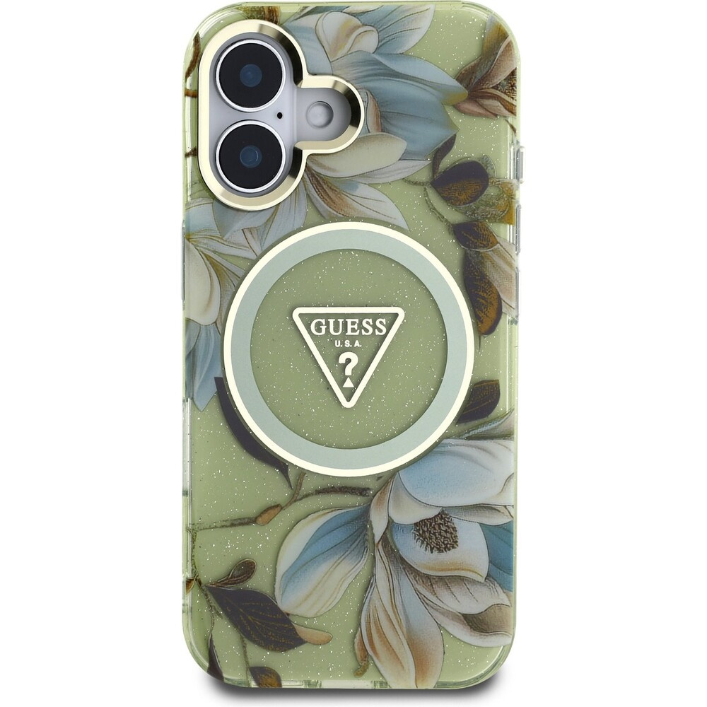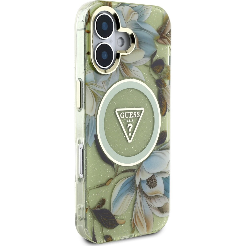 Guess IML Glitter Magnolia and Triangle Logo MagSafe kryt iPhone 16 zelený