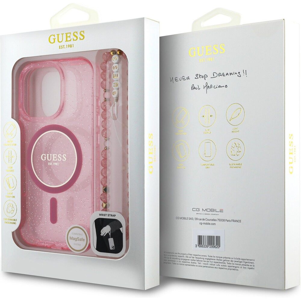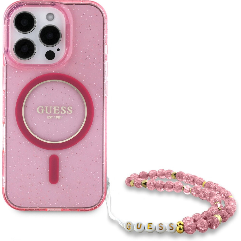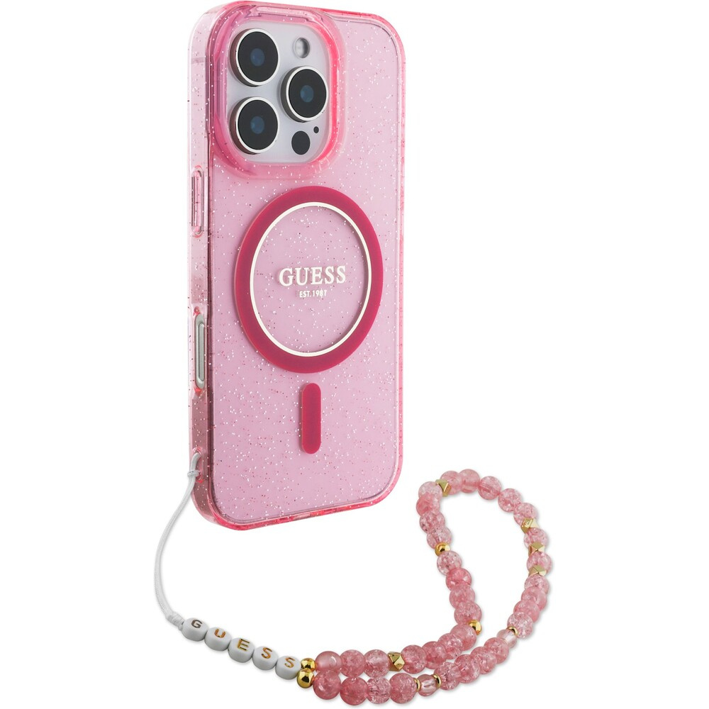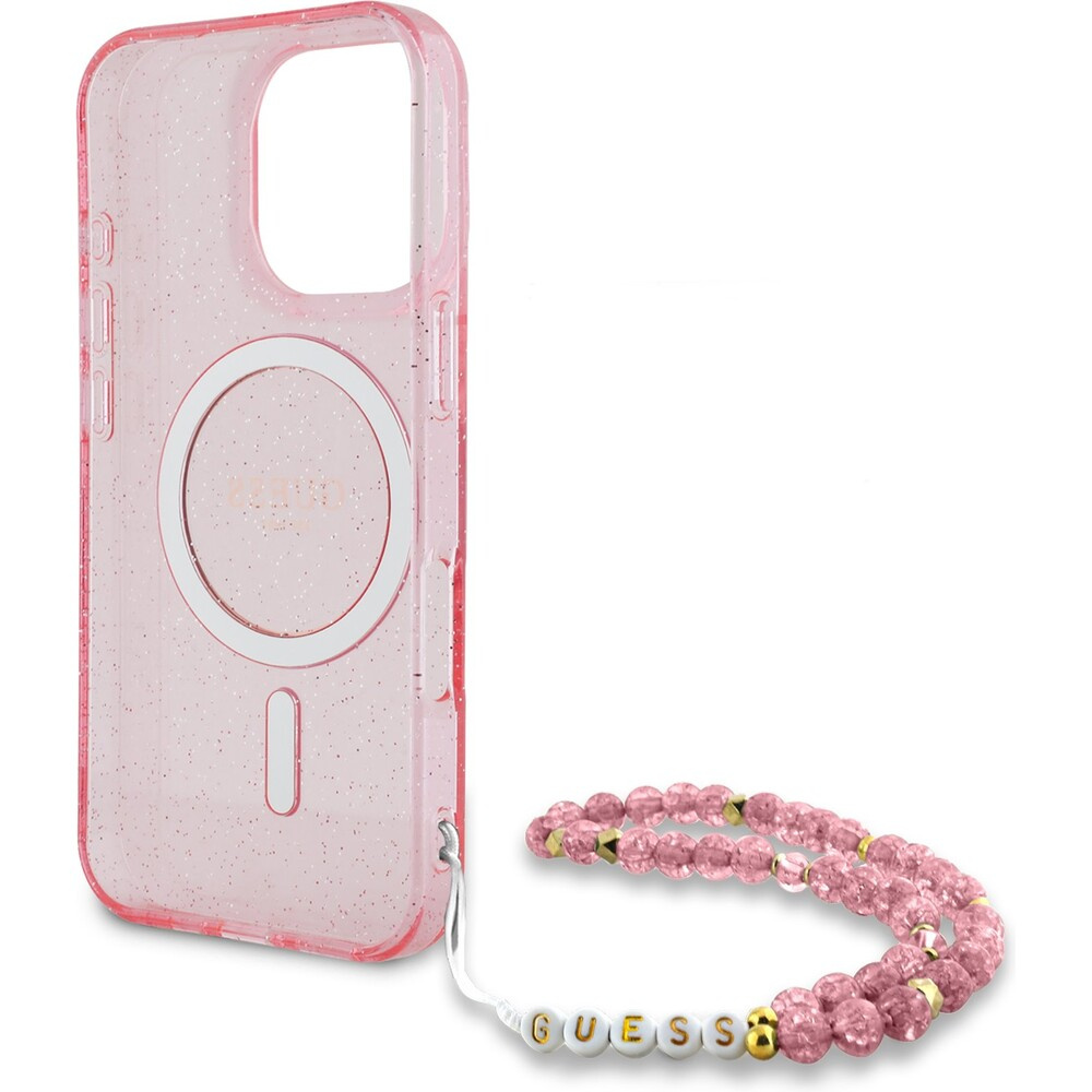 Guess IML Glitter Strap MagSafe kryt iPhone 16 Pro Max růžový