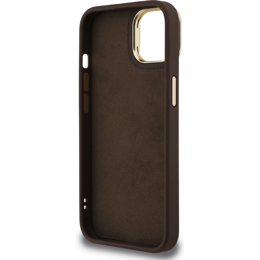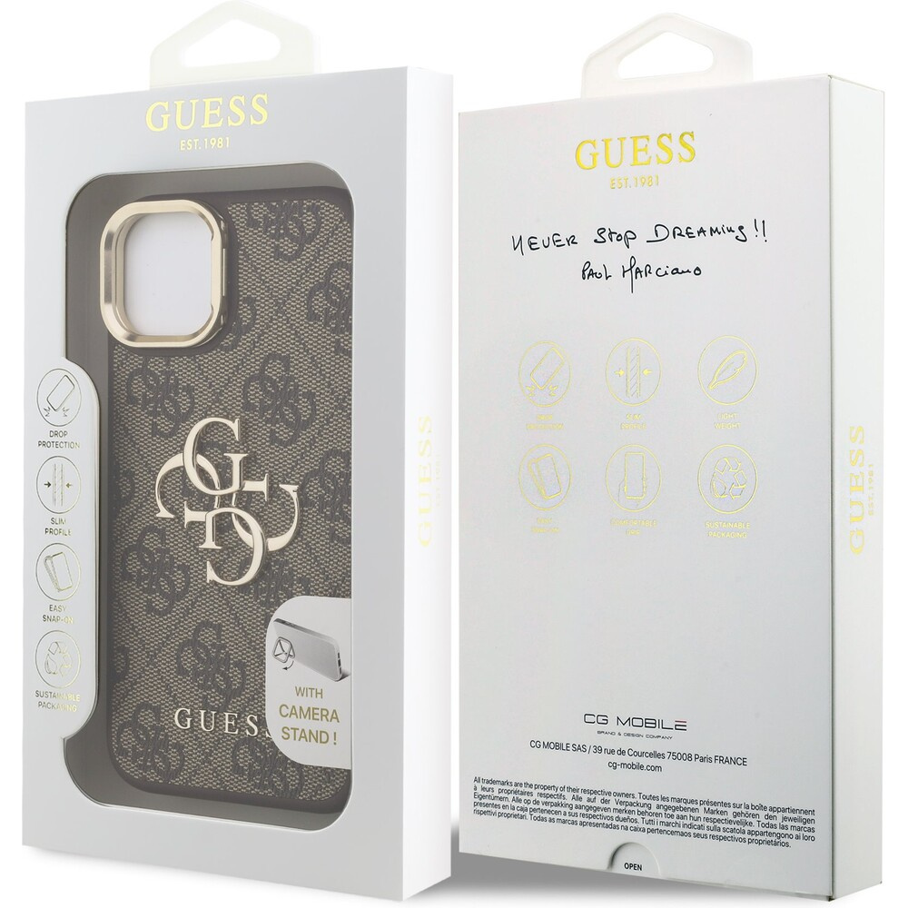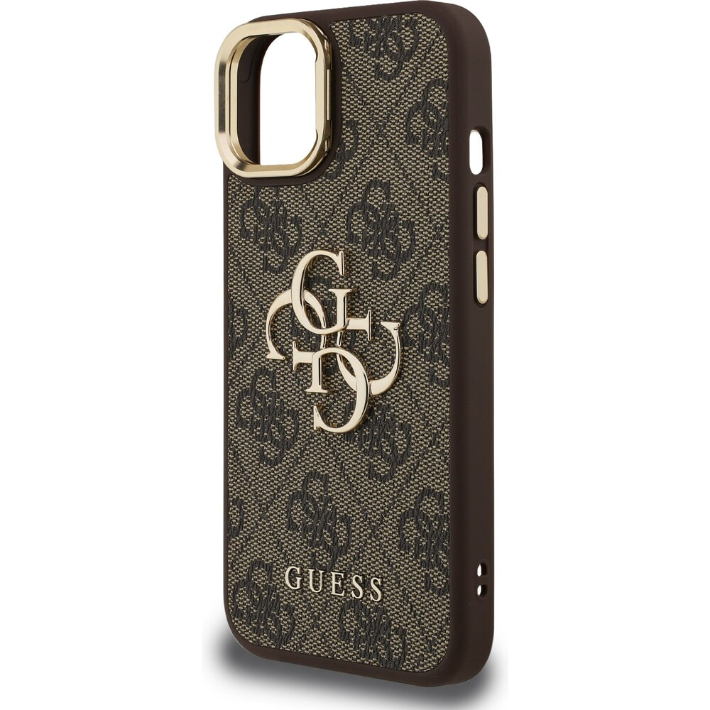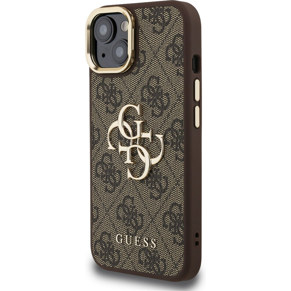 Guess PU 4G Metal Logo Stand Camera Frame kryt iPhone 14 hnědý
