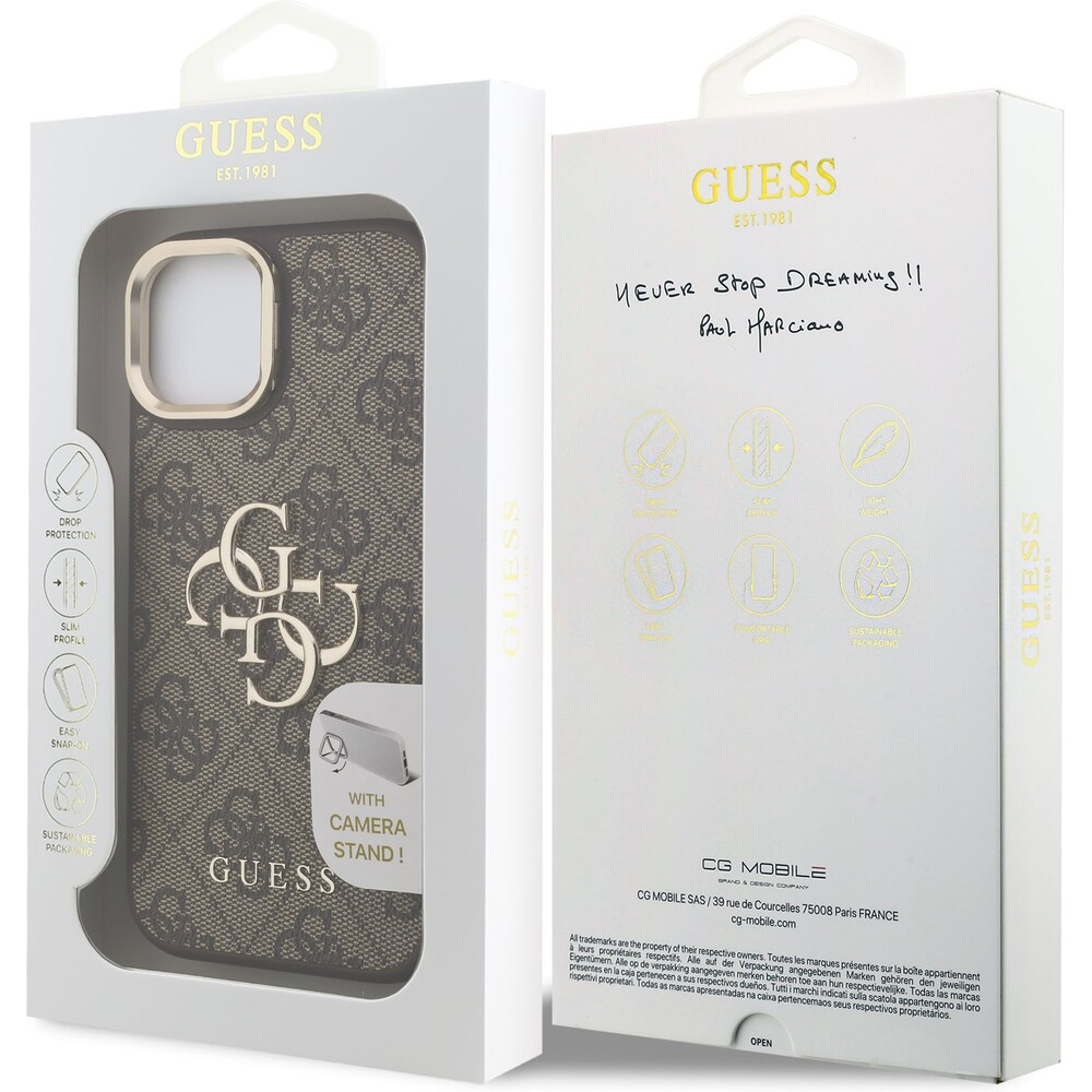 Guess PU 4G Metal Logo Stand Camera Frame kryt iPhone 15 hnědý