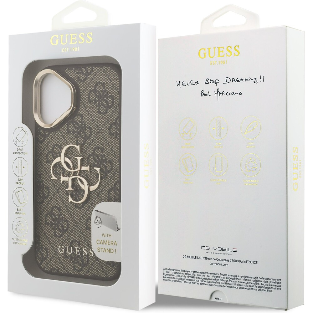 Guess PU 4G Metal Logo Stand Camera Frame kryt iPhone 16 hnědý