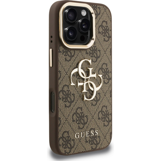 Guess PU 4G Metal Logo Stand Camera Frame kryt iPhone 16 Pro hnědý