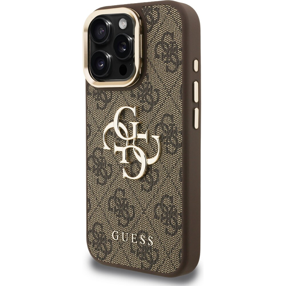 Guess PU 4G Metal Logo Stand Camera Frame kryt iPhone 16 Pro hnědý