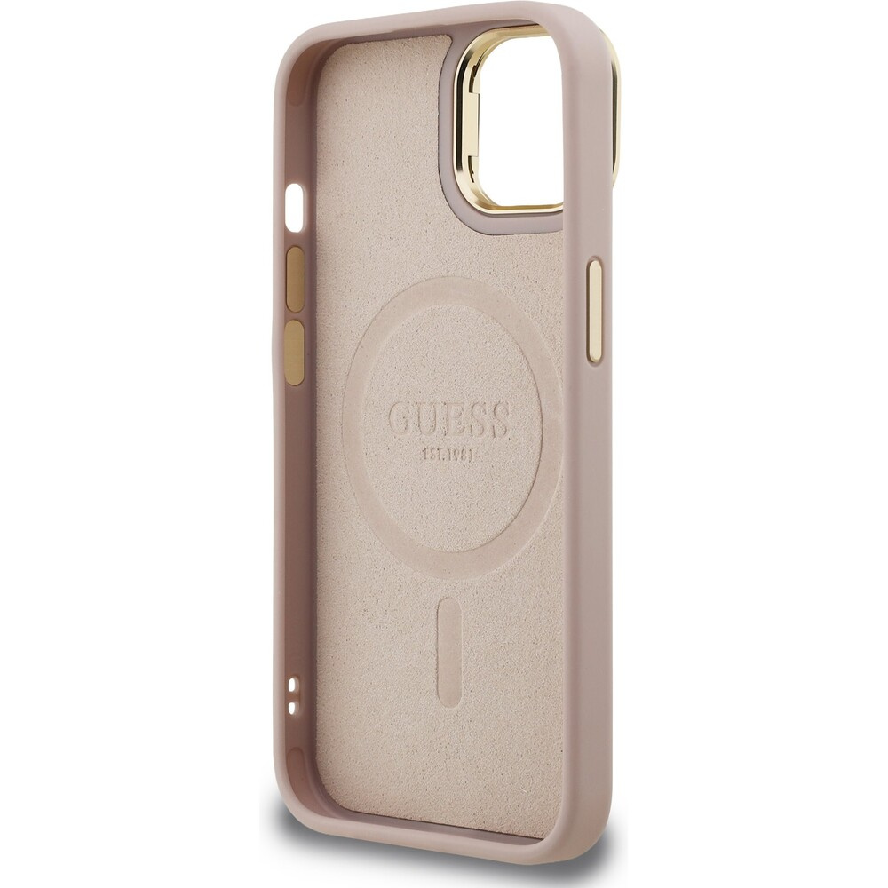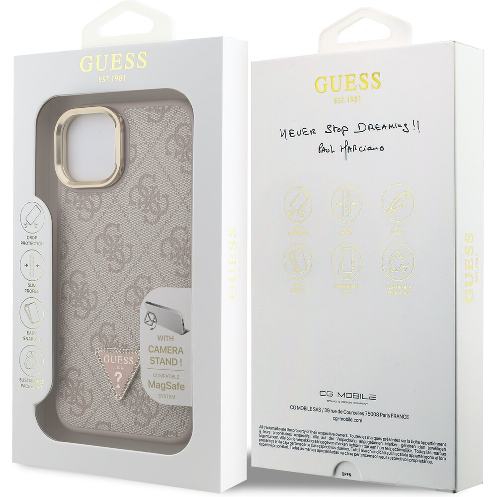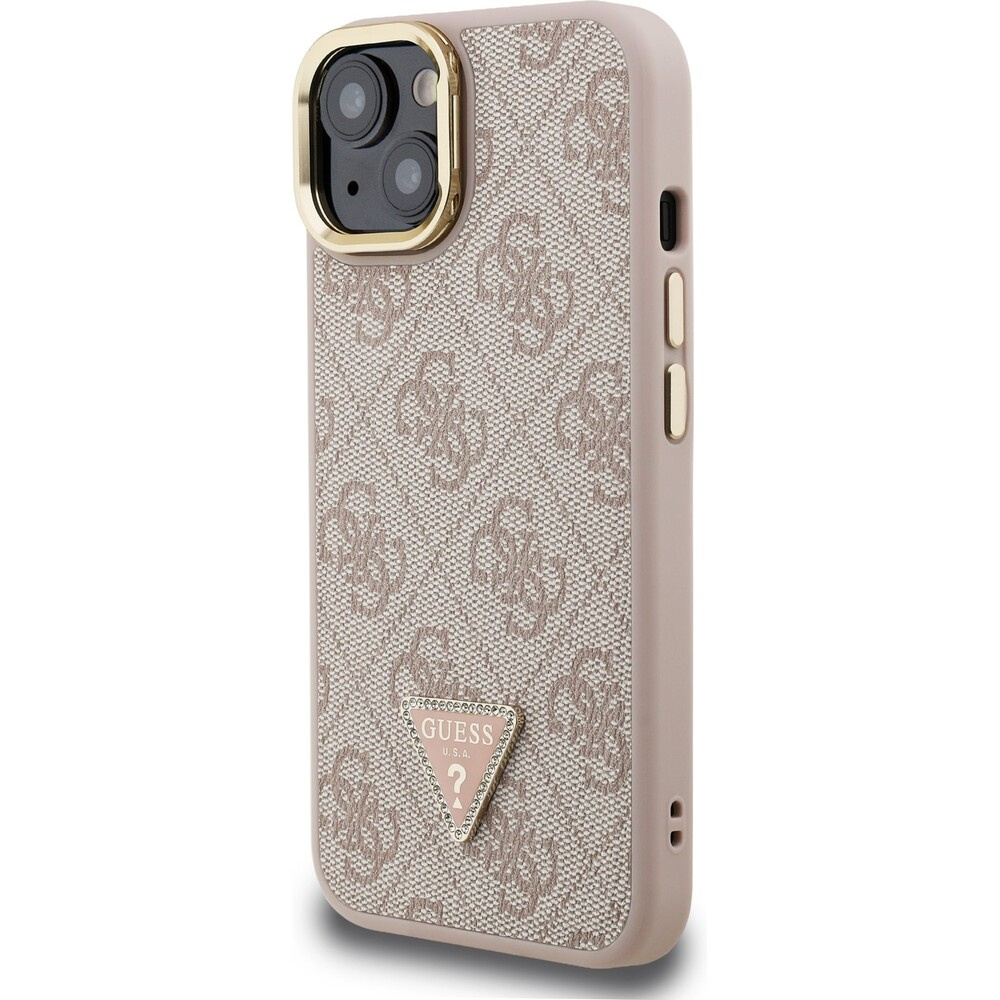 Guess PU 4G Strass Triangle Logo Stand Camera Frame MagSafe kryt iPhone 14 růžový