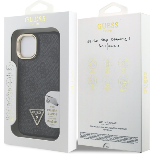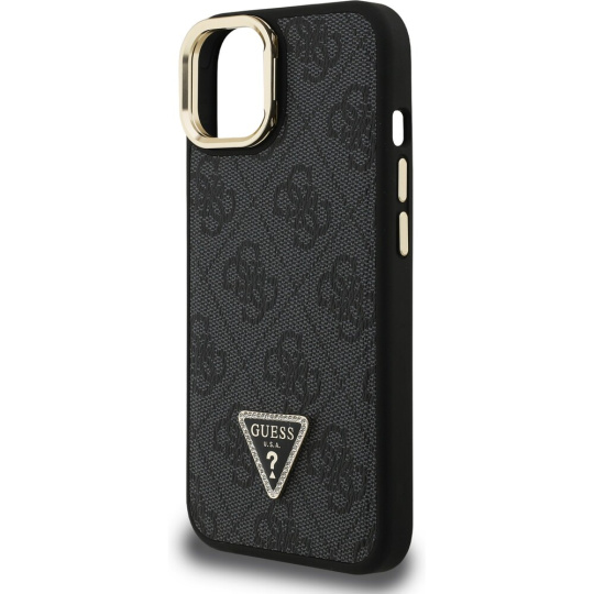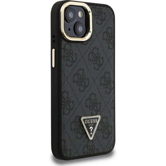 Guess PU 4G Strass Triangle Logo Stand Camera Frame MagSafe kryt iPhone 15 černý