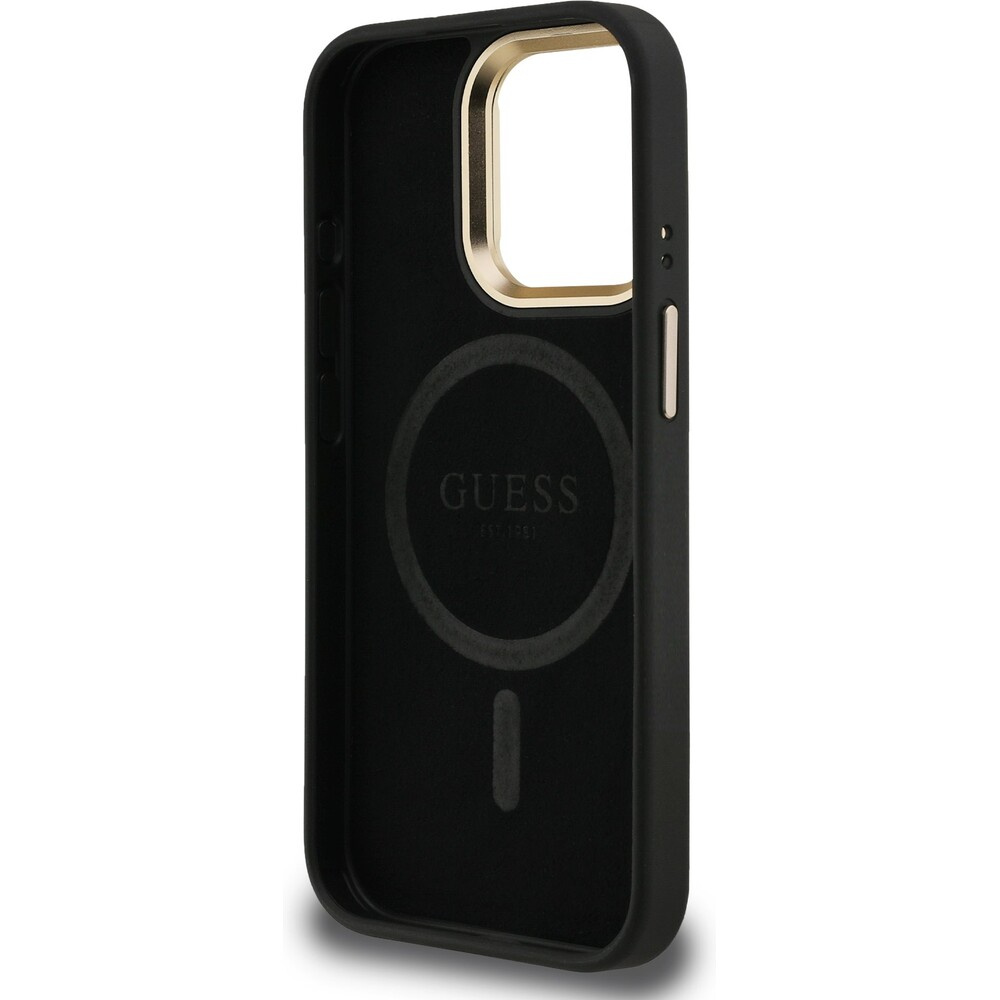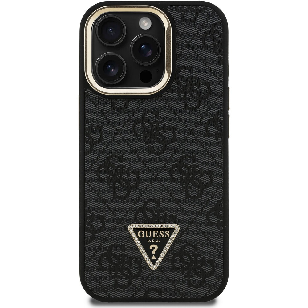 Guess PU 4G Strass Triangle Logo Stand Camera Frame MagSafe kryt iPhone 15 Pro černý