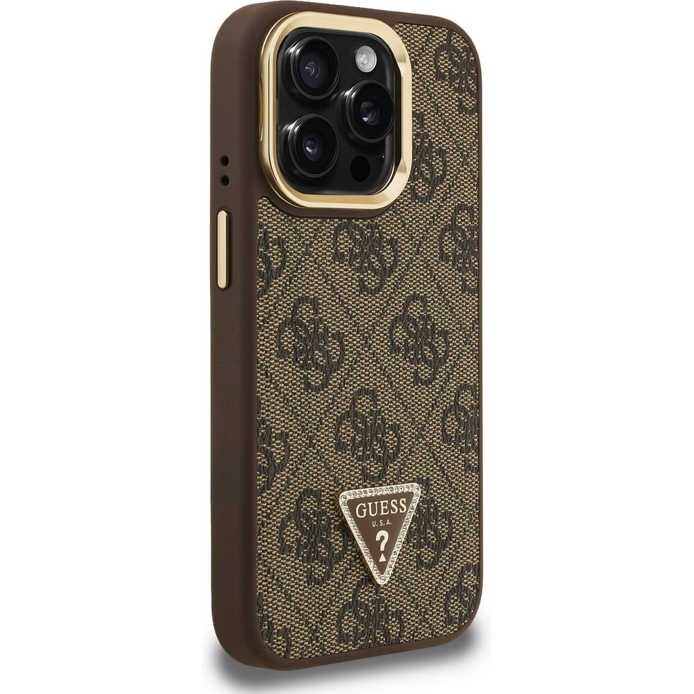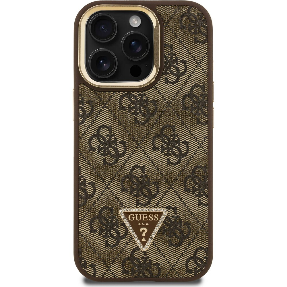 Guess PU 4G Strass Triangle Logo Stand Camera Frame MagSafe kryt iPhone 15 Pro hnědý