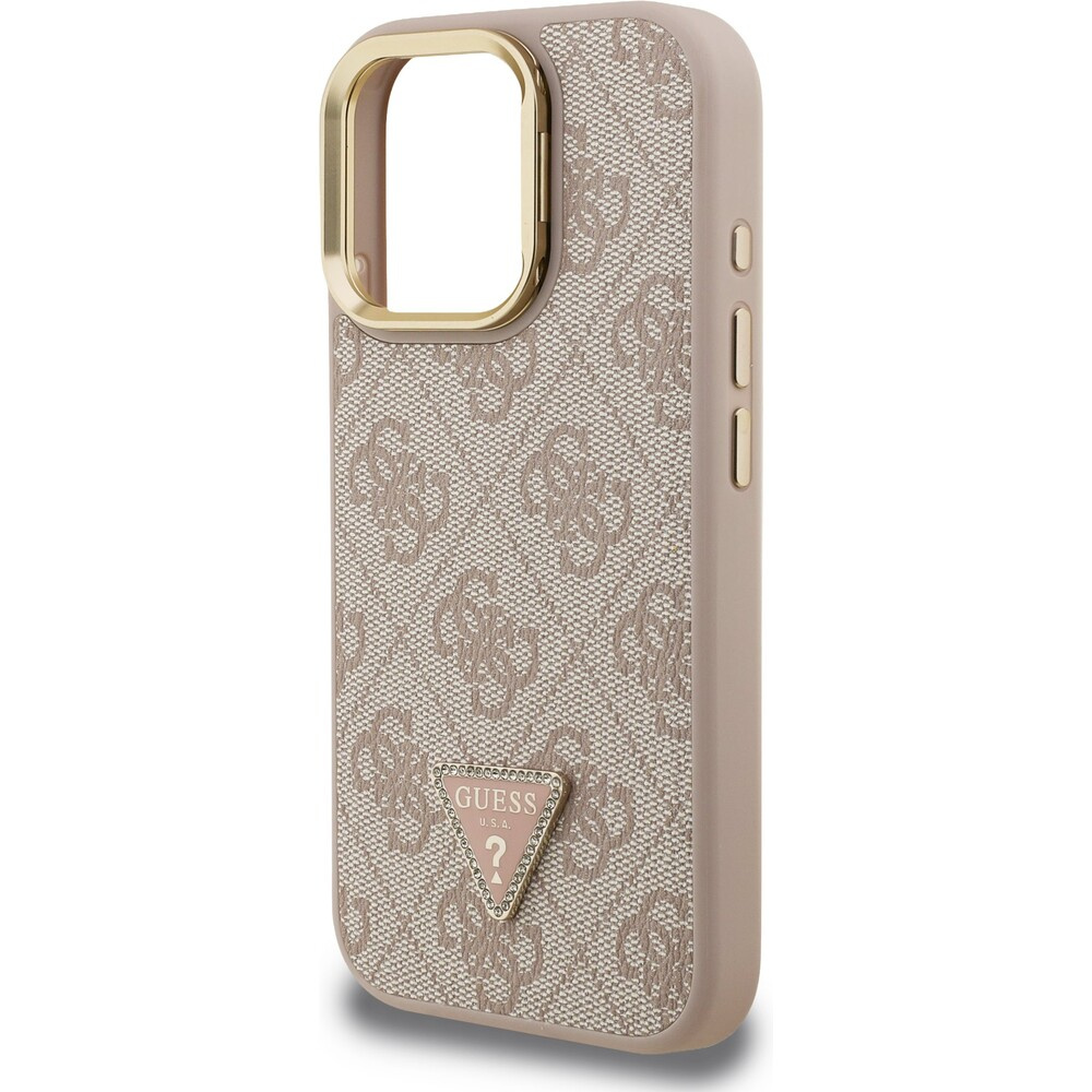 Guess PU 4G Strass Triangle Logo Stand Camera Frame MagSafe kryt iPhone 15 Pro růžový