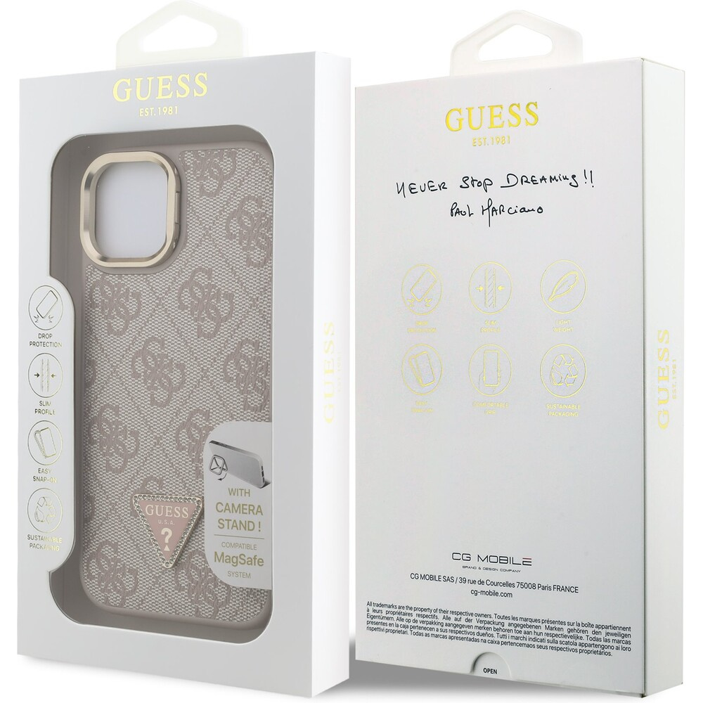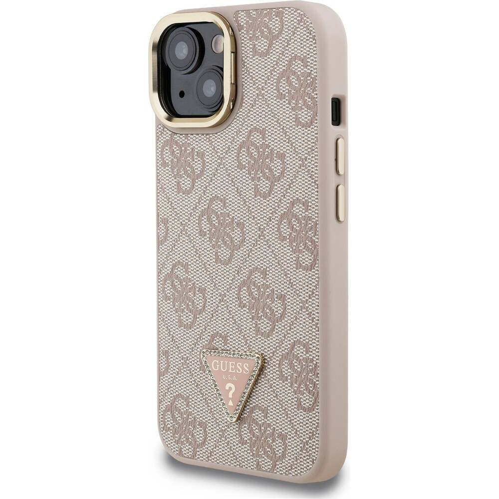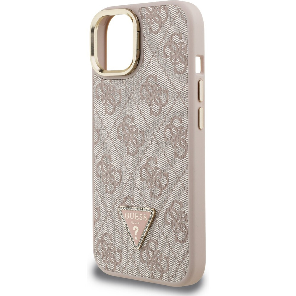 Guess PU 4G Strass Triangle Logo Stand Camera Frame MagSafe kryt iPhone 15 růžový