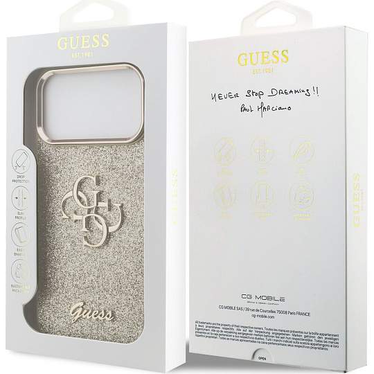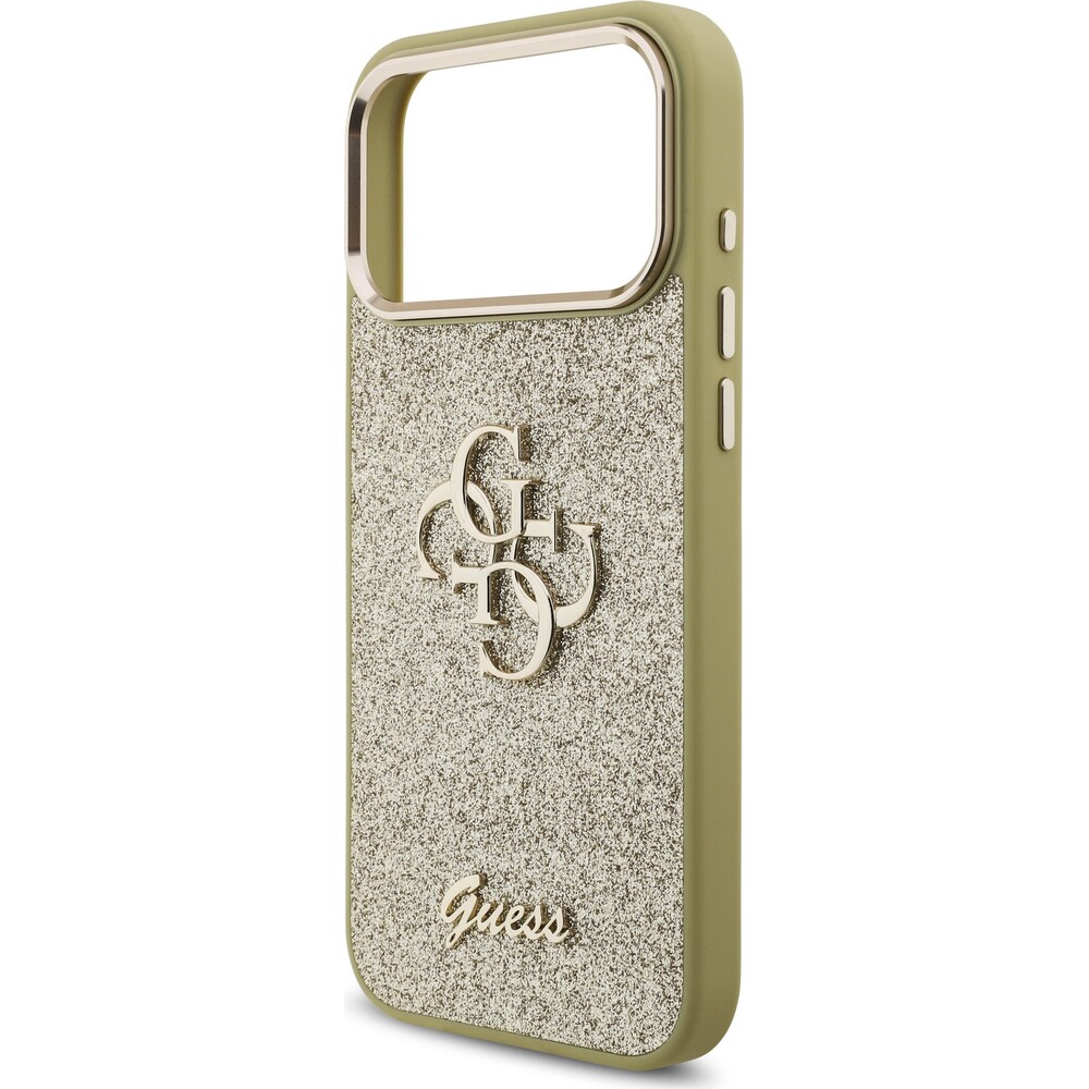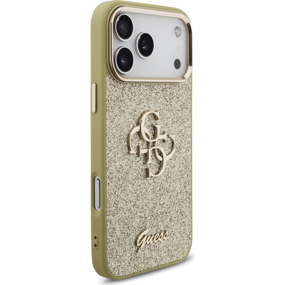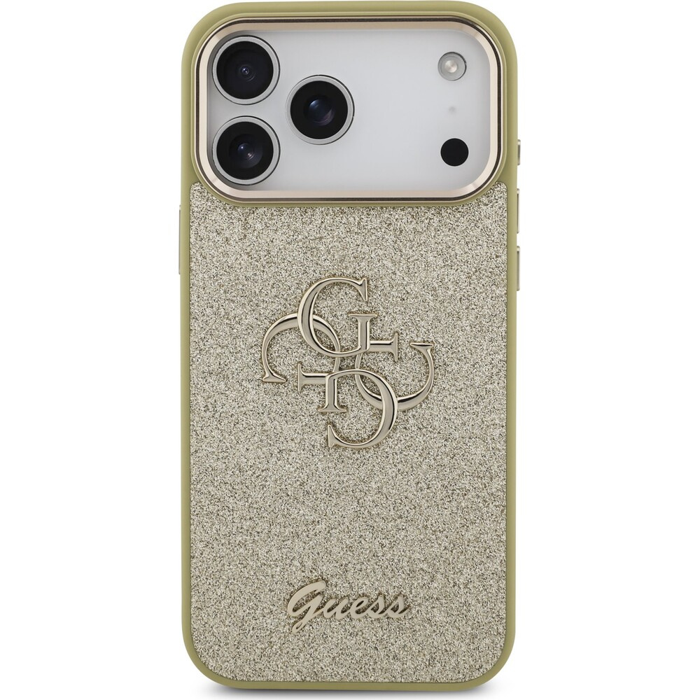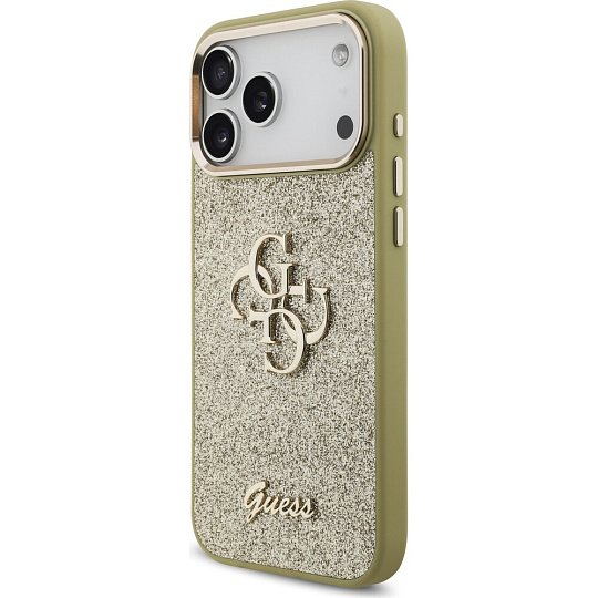Guess PU Fixed Glitter 4G Metal Frame kryt iPhone 17 Pro Max zlatý