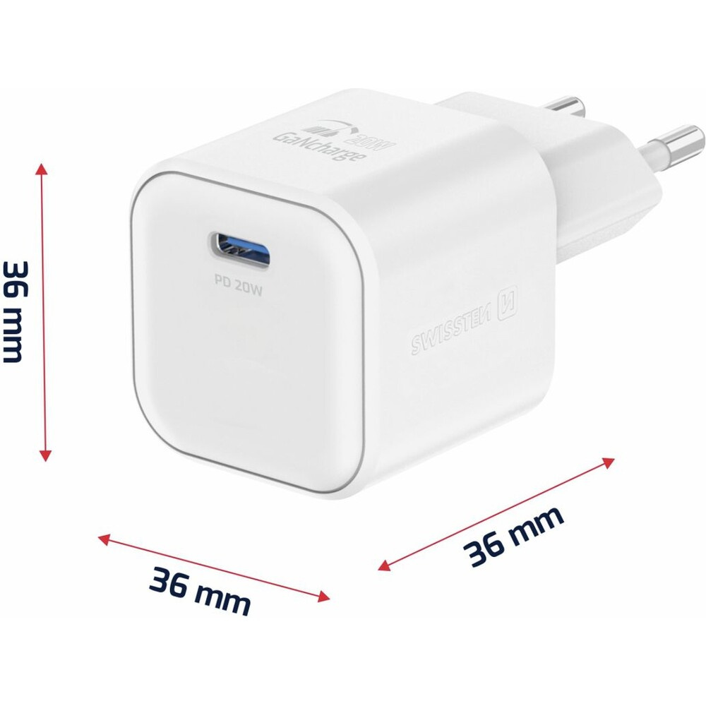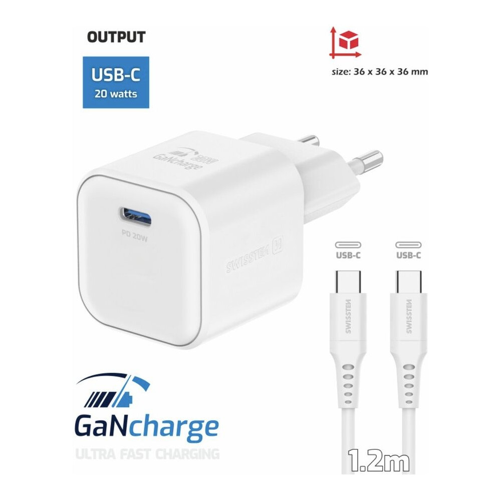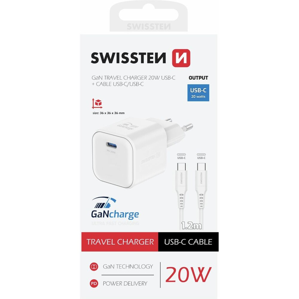 Swissten síťový adaptér GaN 1x USB-C 20W PD + datový kabel USB-C/USB-C 1,2 m bílý