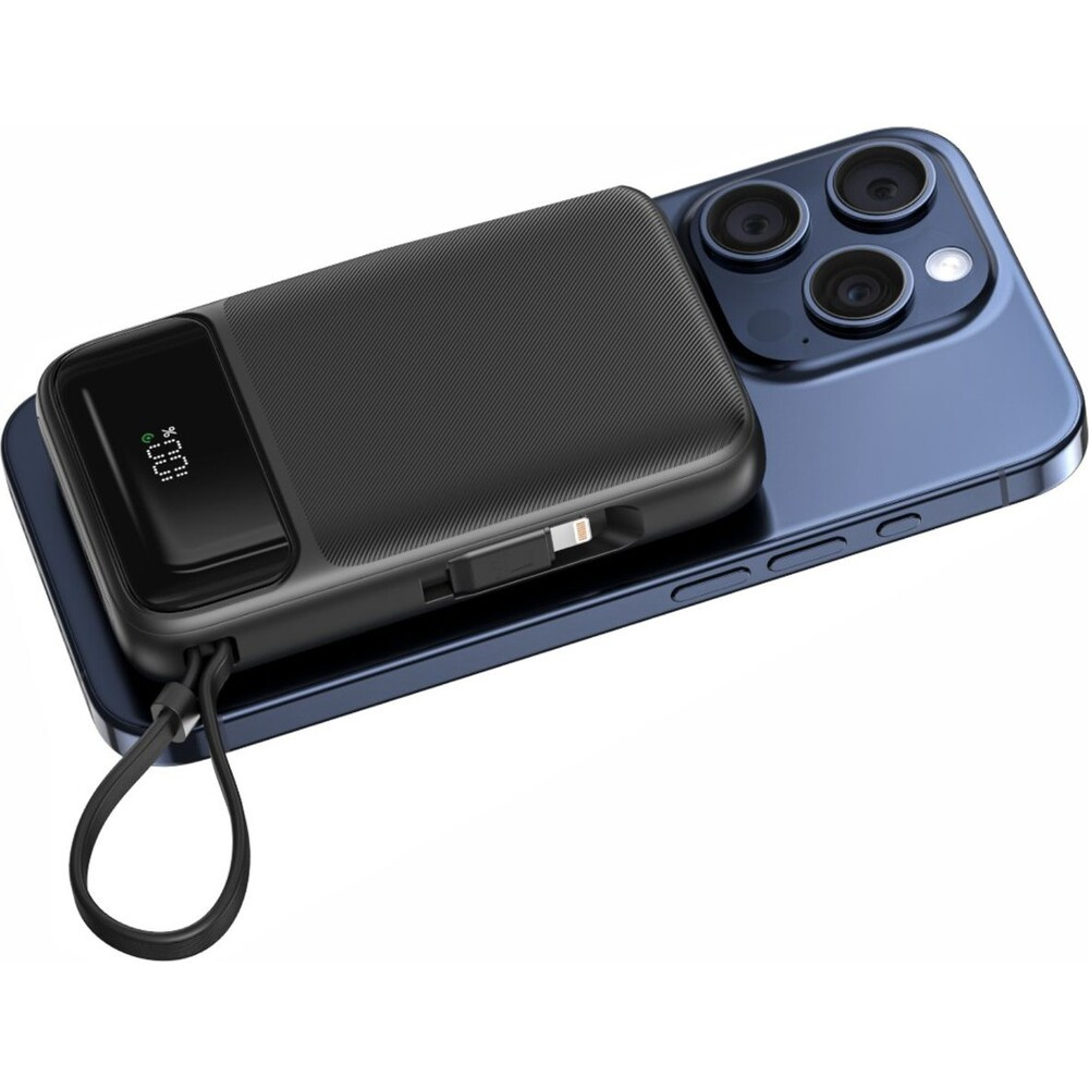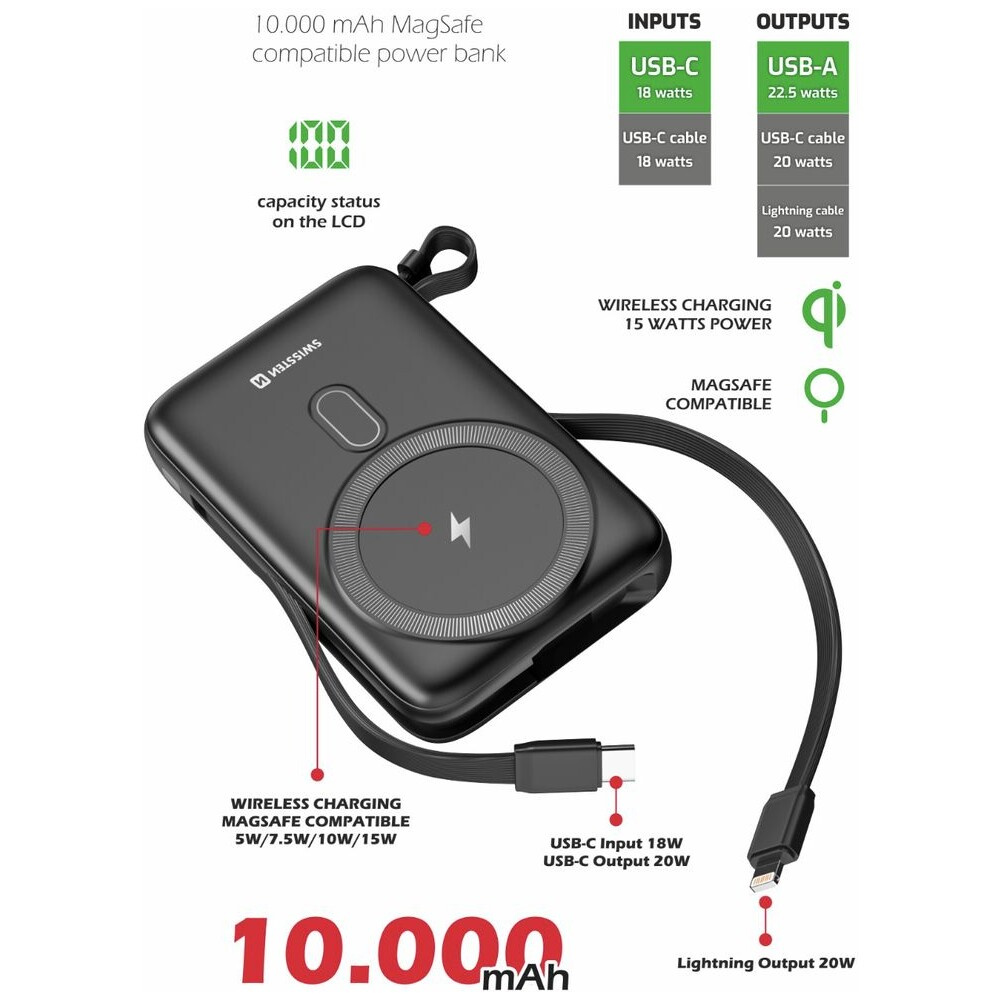Swissten MagSafe powerbanka 10 000 mAh PD 20W, s USB-C/Lightning černá