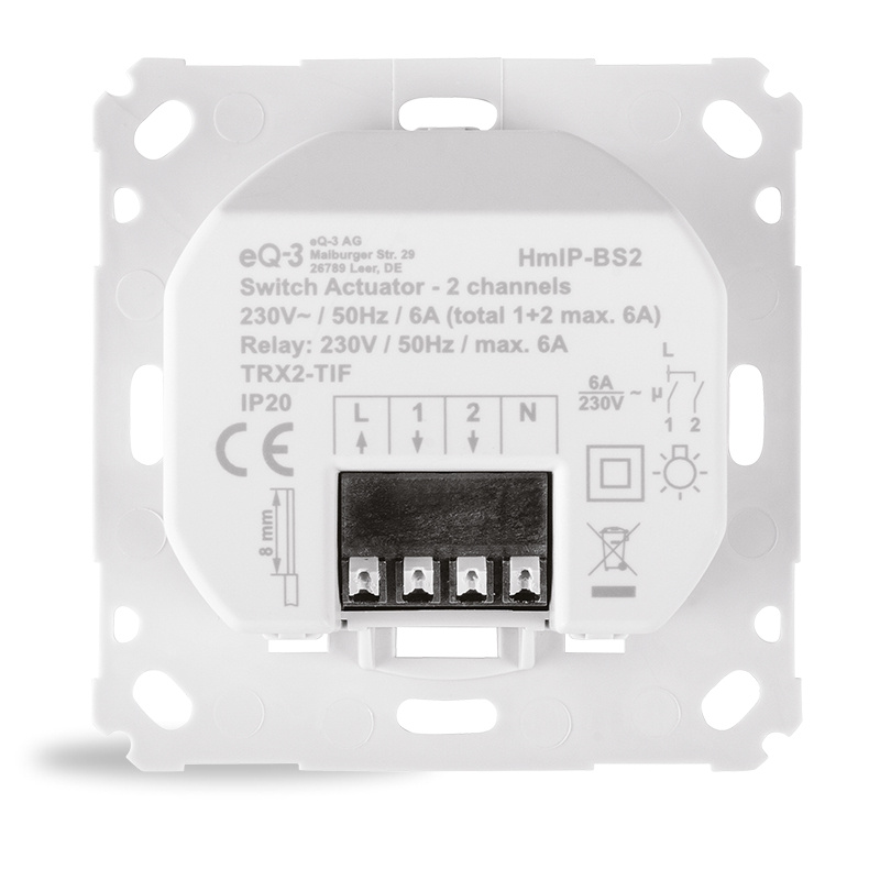 Programovatelný bezdrátový Spínací akční člen dvoukanálový (HmIP-BS2) pro zápustnou montáž, napájený ze sítě 230 V, je součástí systému chytré domácnosti Homematic IP.