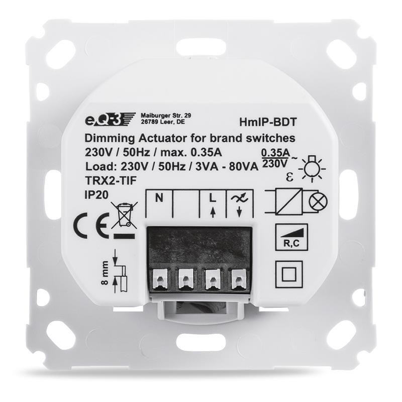 Stmívací akční člen (HmIP-BDT) se montuje do standardní zápustné krabice pod omítku s připojením do sítě 230 V. Bezdrátová komunikace nabízí možnost instalace bez potřeby druhotné kabeláže. To znamená, že akční člen lze umístit v místě připraveného nebo stávajícího elektrického rozvodu sítě 230 V.