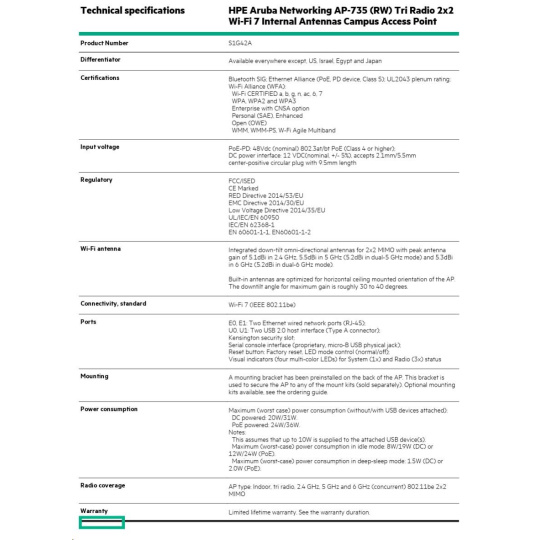 HPE Aruba Networking AP-735 (RW) Tri Radio 2x2 Wi-Fi 7 Internal Antennas Campus Access Point