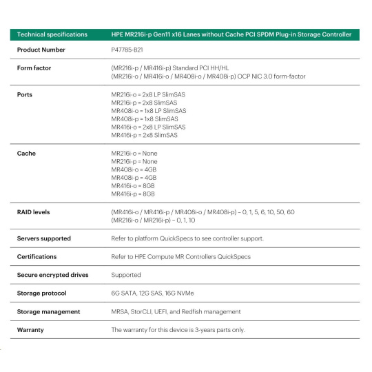 HPE MR216i-p Gen11 16 Internal Lanes/No Cache SPDM PCI Plug-in Storage Controller (raid 0,1,10 only).