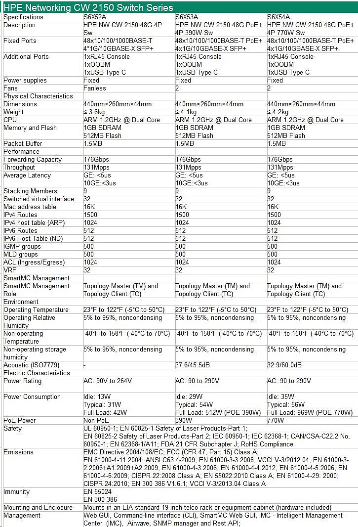 HPE Networking CW 2150 48p 10M/100M/1G PoE+ 4p SFP+ 1G/10G 770W Switch.