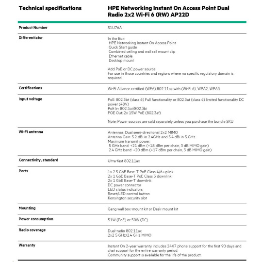- Product Name: HPE Networking Instant On Access Point Dual Radio 2x2 Wi-Fi 6 (RW) AP22D