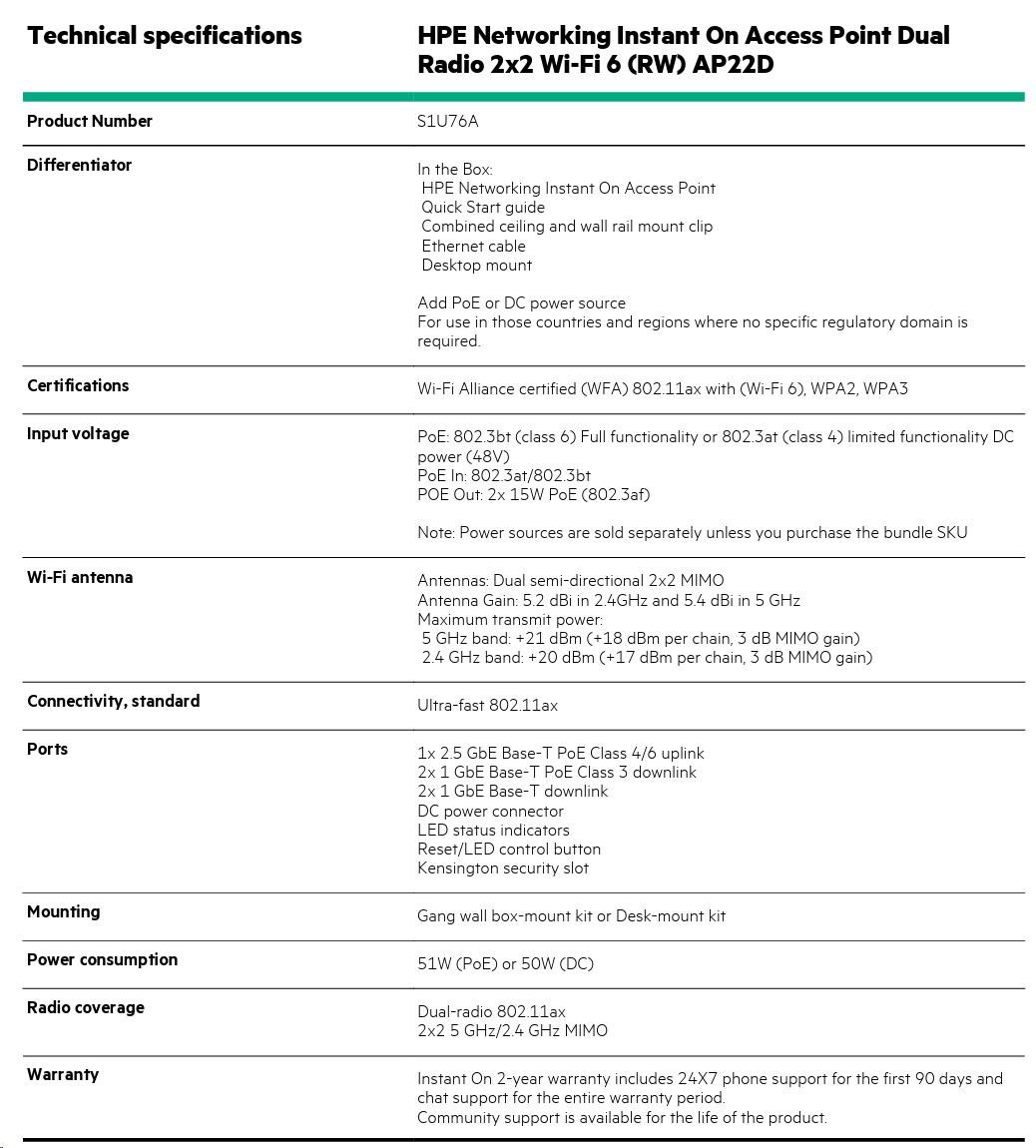 - Product Name: HPE Networking Instant On Access Point Dual Radio 2x2 Wi-Fi 6 (RW) AP22D