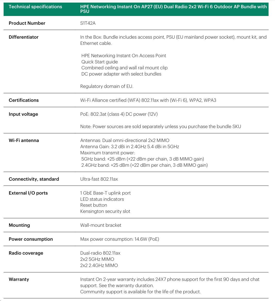HPE Networking Instant On AP27 (EU) Dual Radio 2x2 Wi-Fi 6 Outdoor AP Bundle with PS (Includes 30W PoE midspan injector with EU Power Cord)
