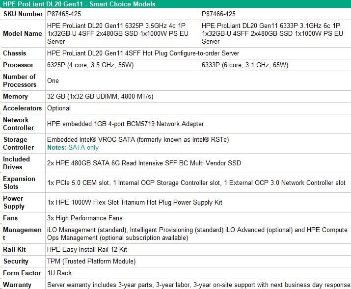 HPE PL DL20 gen11 6333P (3.1G/6C12T) 1x32G 4SFF 2x480GB VROC 1x1000W 4x1G NBD333 Smart Choice.