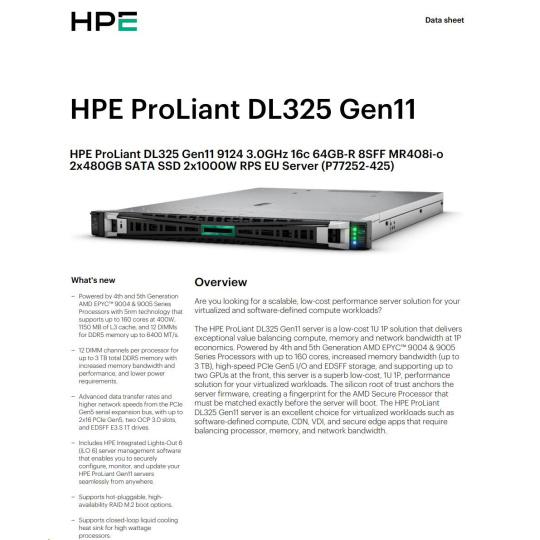 | Model Name | HPE ProLiant DL325 Gen11 9124 3.0GHz 16c 64GB-R 8SFF MR408i-o 2x480GB SATA SSD 2x1000W RPS EU Server |