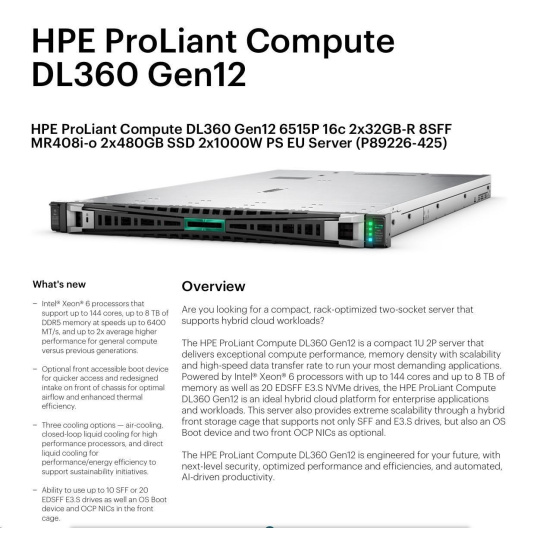 HPE PL DL360 Gen12 6515P (2.4/16C) 2x32G (P69727) 2x480G MR408i-o 8SFF 2x1000W 10GbE NBD333 Smart Choice