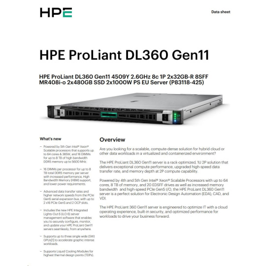 HPE PL DL360g11 4509Y (2.6G/8C) 2x32G (p64706) 2x480G 2x1000W MR408i-o 8SFF 4p1G ocp Smart Choice.