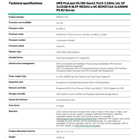 Technical specifications HPE ProLiant DL385 Gen11 9115 3.2GHz 16c 1P 2x32GB-R 8LFF NS204i-u NC BCM57416 2x1000W PS EU