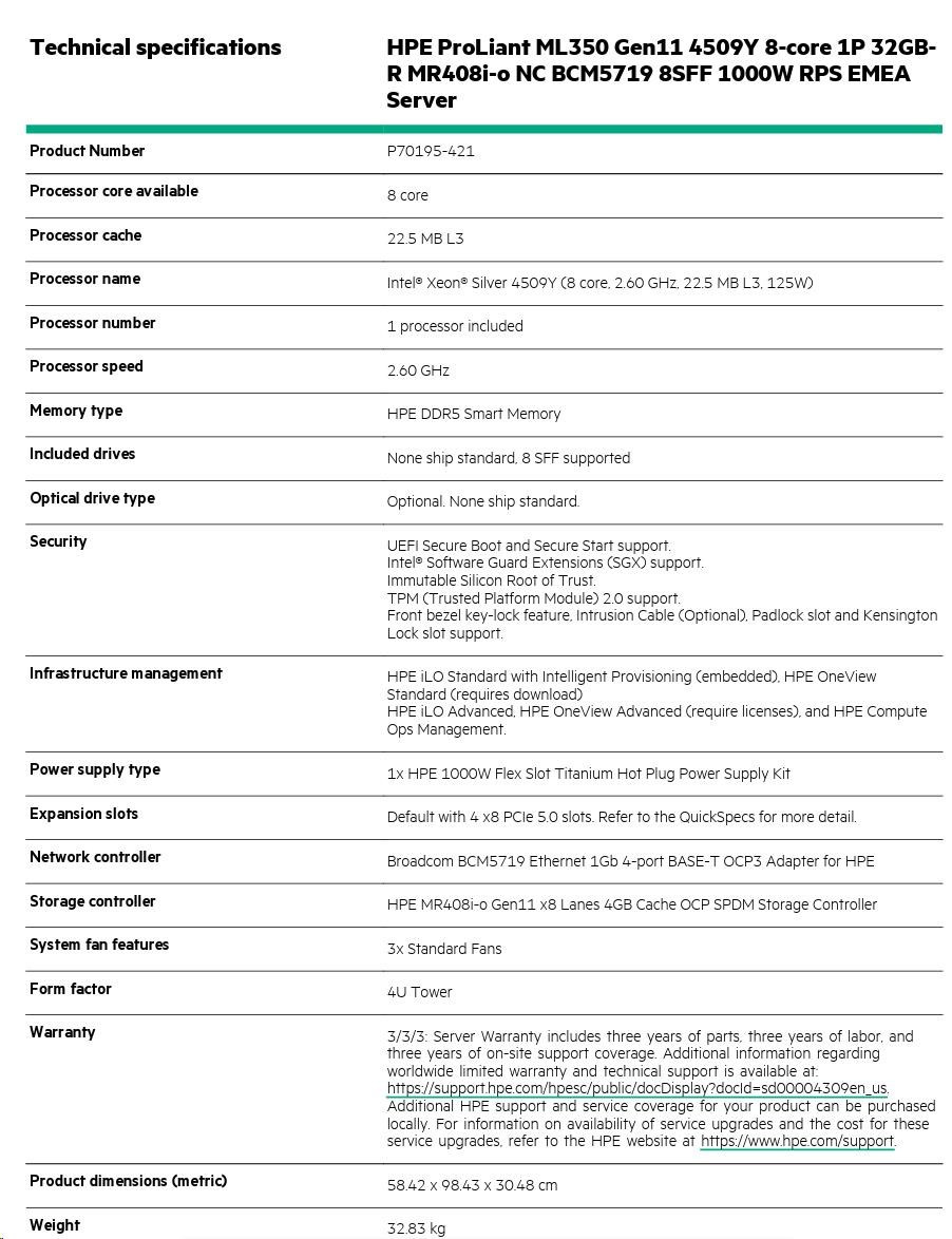 | SKU Number | P70195-421: HPE ProLiant ML350 Gen11 4509Y 8-core 1P 32GB-R MR408i-o NC BCM5719 8SFF 1000W RPS EMEA Server |