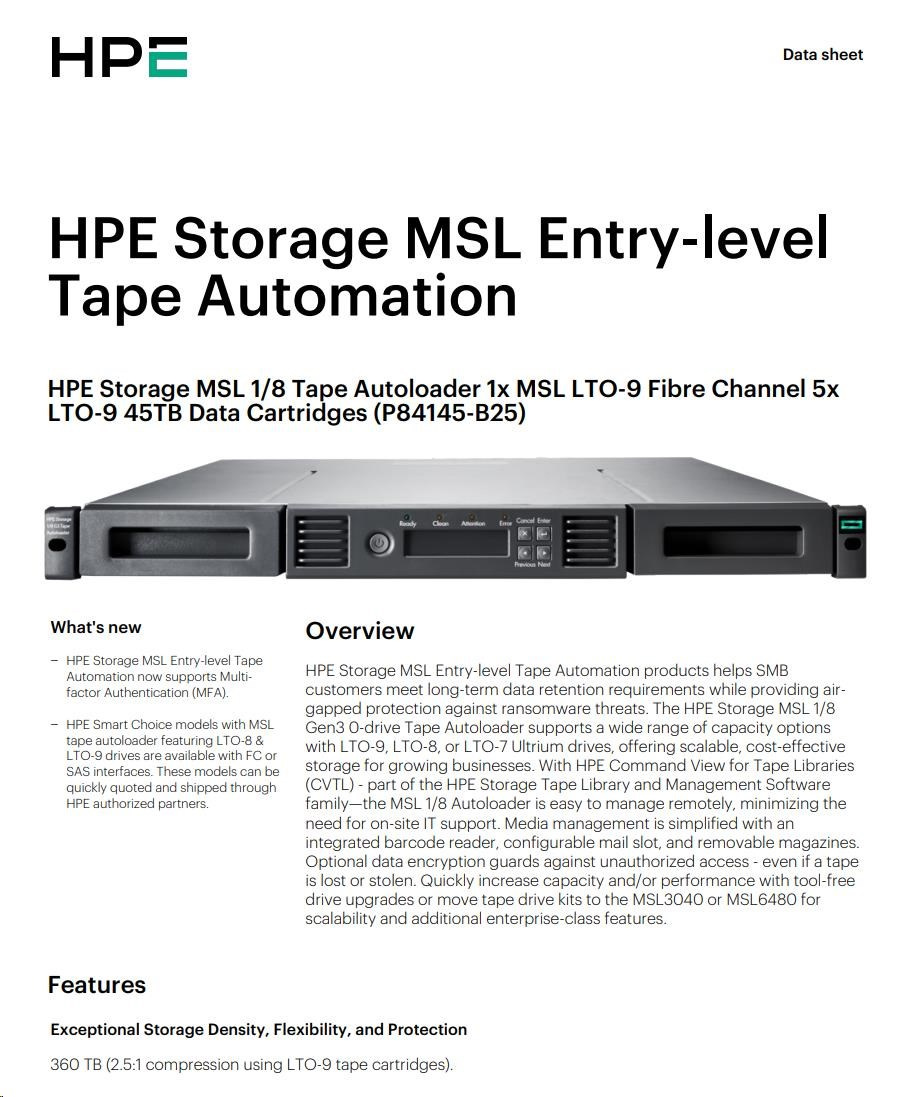 HPE Storage MSL 1/8 Tape Autoloader 1x MSL LTO-9 Fibre Channel 5x LTO-9 45TB Data Cartridges.