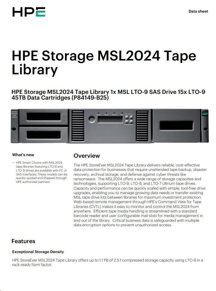 HPE Storage MSL2024 Tape Library 1x MSL LTO-9 SAS Drive 15x LTO-9 45TB Data Cartridges.