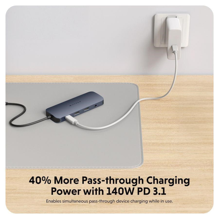 Rychlý a spolehlivý gigabitový ethernet poskytuje vysokorychlostní a spolehlivé kabelové připojení k internetu, což umožňuje rychlejší přenos dat, plynulé streamování videa a lepší zážitky při hraní online her. Čas jsou peníze, a proto vám přichází na pomoc USB-C Hub Hyper EcoSmart™ druhé generace. Tento datový sprinter posune vaší práci na vyšší úroveň.Průchozí nabíjení pomocí USB-C Power Delivery 140 W PD 3.1