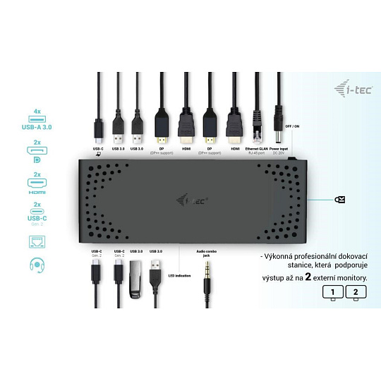 Výkonná kancelářská dokovací stanice s podporou superrychlých portů USB Gen 2. Dokovací stanice podporuje výstup až na dva externí monitory ve vysokém rozlišení až 4K. Dokovací stanici lze použít prakticky se všemi notebooky, protože podporuje připojení ke všem běžným portům: 3.0, USB-C a Thunderbolt“ 3/4 a zároveň podporuje všechny běžné současné operační systémy.