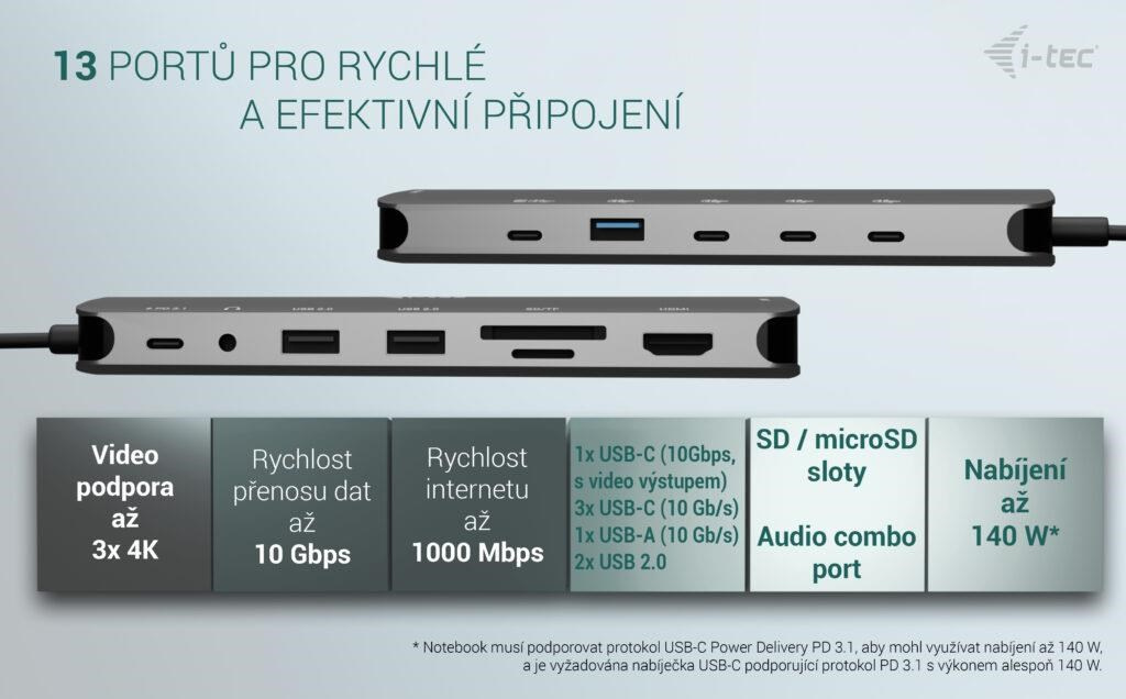 ** Pokud váš notebook nebo tablet podporuje nový a moderní nabíjecí protokol USB-C Power Delivery PD 3.1, dokovací stanice nabídne nabíjecí výkon až 140 W (pokud máte protokol PD 3.0, nabíjecí výkon bude až 100 W).