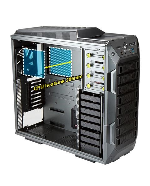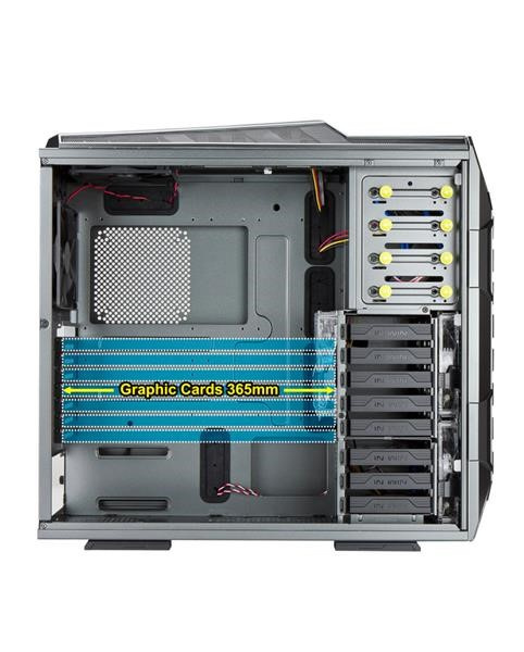 Tak abyste si mohli využít maximální výkon svého počítače, lze dovnitř skříně zakomponovat dvě jednotky vodního chlazení, a to do vrchní části až do délky 360 mm, a spodní částí až do délky 240 mm. Pro optimální cirkulaci vzduchu uvnitř skříně lze umístit až 10 větráků (včetně 4 předinstalovaných).