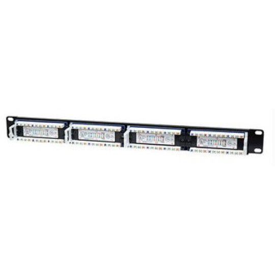 • Solid and reliable terminations for copper cabling featuring a minimum of 3 mm 50 micro-inch gold-plated jack contacts • Compatible with both 110 and Krone punch-down tools • Supports 22 to 26 AWG stranded and solid wire • For use with unshielded twisted pair (UTP) Cat5e network cable • Ideal for Ethernet, Fast Ethernet and Gigabit Ethernet network applications • Connects RJ-45 ports to a network • Meets 19” rackmount standards.
