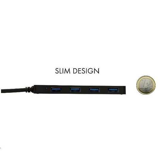 Tento HUB nabízí čtyři USB 3.0 porty s funkcí Plug & Play a standardním USB nabíjením – HUB automaticky detekuje, jestli je připojeno zařízení pro USB nabíjení. Rozhraní USB 3.0 je důležité zejména pro datové přenosy z USB 3.0 paměťových karet a flash disků, kde se nejvíce využije jeho vysoká přenosová rychlost. LED dioda zobrazuje stav čtení a zápisu dat.