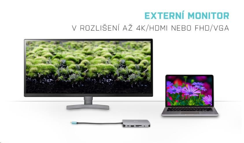 Malá kovová USB-C dokovací stanice, která dokáže snadno připojit externí monitor či projektor, a to prostřednictvím portu HDMI nebo VGA. Jednoduše připojte váš notebook či tablet (instalace ovladačů není nutná) a využijte rychlého datového USB, připojení k internetu prostřednictvím LAN portu, spolu s možností připojit vaše sluchátka a mikrofon. Samozřejmostí je podpora napájení vašeho notebooku, a to až do 100 W, což znamená, že budete schopni nabít všechny notebooky a tablety, které nabíjení prostřednictvím USB-C (USB-C Power Delivery) podporují.