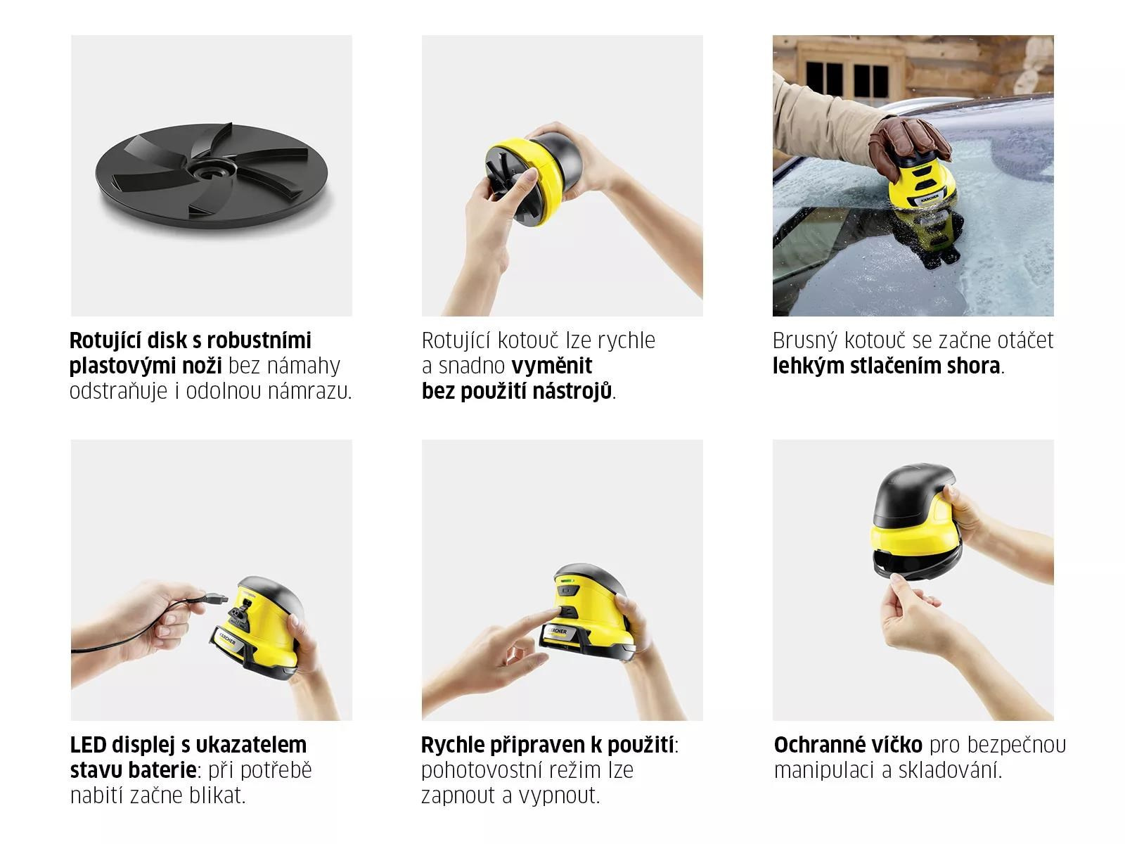 Již žádné náročné vyprošťování auta z ledové krusty. Ruce nechte pěkně v teple rukavic a usnadněte si práci pomocí elektrické škrabky na led EDI 4. Rotující kotouč s plastovými čepelemi pracuje rychle a hravě zatočí i s silnou námrazou, aniž by poškodil skla. Stačí pouze lehce přitlačit na zmrzlý povrch a led se okamžitě uvolní. Případné opotřebení čepelí snadno vyřešíte výměnou za nový nástavec, který pořídíte v sekci náhradních dílů. Výměna je velmi snadná a zvládnete ji i bez nářadí. Po použití škrabku jednoduše uložte do ochranného krytu, který brání jejímu mechanickému poškození. Stav baterie snadno ověříte pomocí LED signalizace, která vám blikáním oznámí nutnost dobití. Přidejte k nákupu ještě letní sadu nástavců a ze škrabky se během pár tahů stane myčka autoskel.