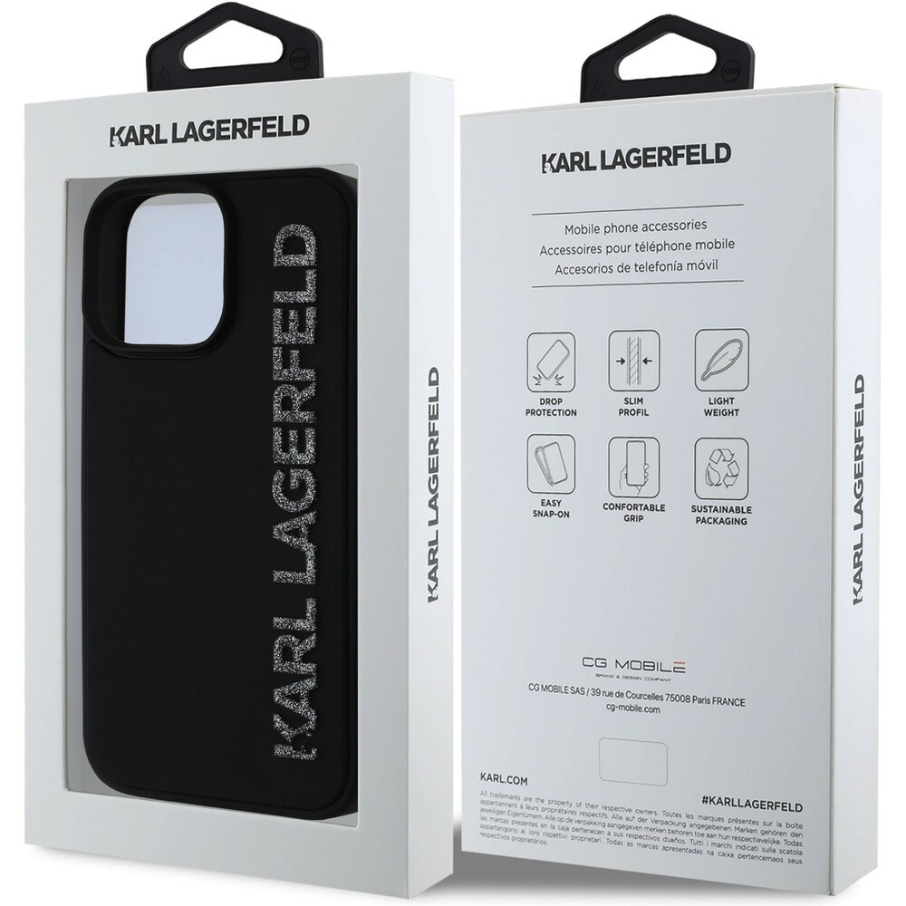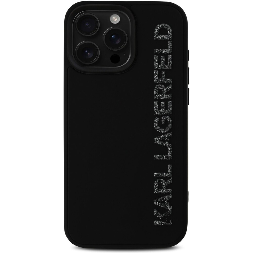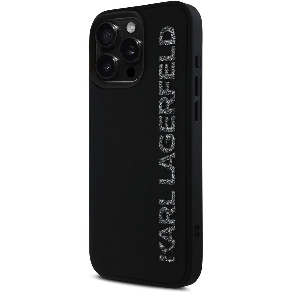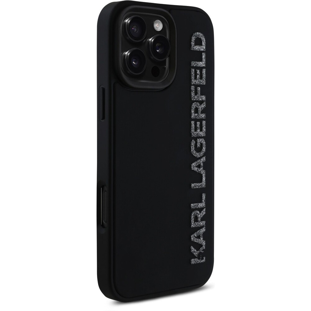 Karl Lagerfeld 3D Rubber Glitter Logo kryt iPhone 16 Pro černý