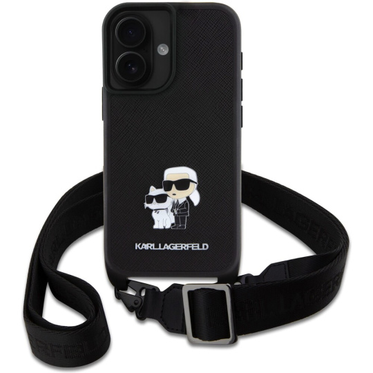 Karl Lagerfeld Saffiano Crossbody Popruh Metal Karl and Choupette kryt pro iPhone 16 černý