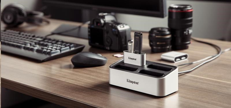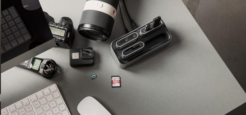 Kingston’s Workflow Station and Readers provide a flexible system to transfer video, photos and audio from multiple sources at once.* Expedite your post-production workflow and create a file offload setup that fits your needs. The Workflow Station Dock is customisable so you can use only the USB miniHub, SD readers or microSD readers that your shoot requires. Whether you’re on a 4K/8K multi-cam shoot with portable audio recorders for each host, or filming B-Roll with drones and GoPros, you can connect up to four readers to the dock simultaneously and transfer footage quickly. The Workflow Station and Readers support USB 3.2 speeds, which get you to your post-production process faster than ever. For added flexibility, the card readers can be used on the go. When you need to shoot on location, simply drop the hub or readers you need into your bag and connect them to your laptop using the included USB-C® cable.