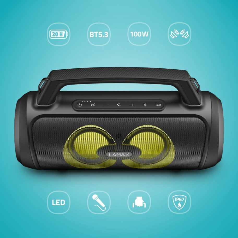 Přenosný Bluetooth party reproduktor s madlem, BT 5.3, výkon 100 W, 3 režimy LED podsvícení, 20 hodin výdrž, ovládání přes zařízení s iOS nebo Android, drátový mikrofon v balení, LAMAX BeatBass®, voděodolnost IP67, 6,3 mm jack, SD karta, USB-A vstup, funkce powerbanky, TWS funkce pro připojení druhého reproduktoru..... více